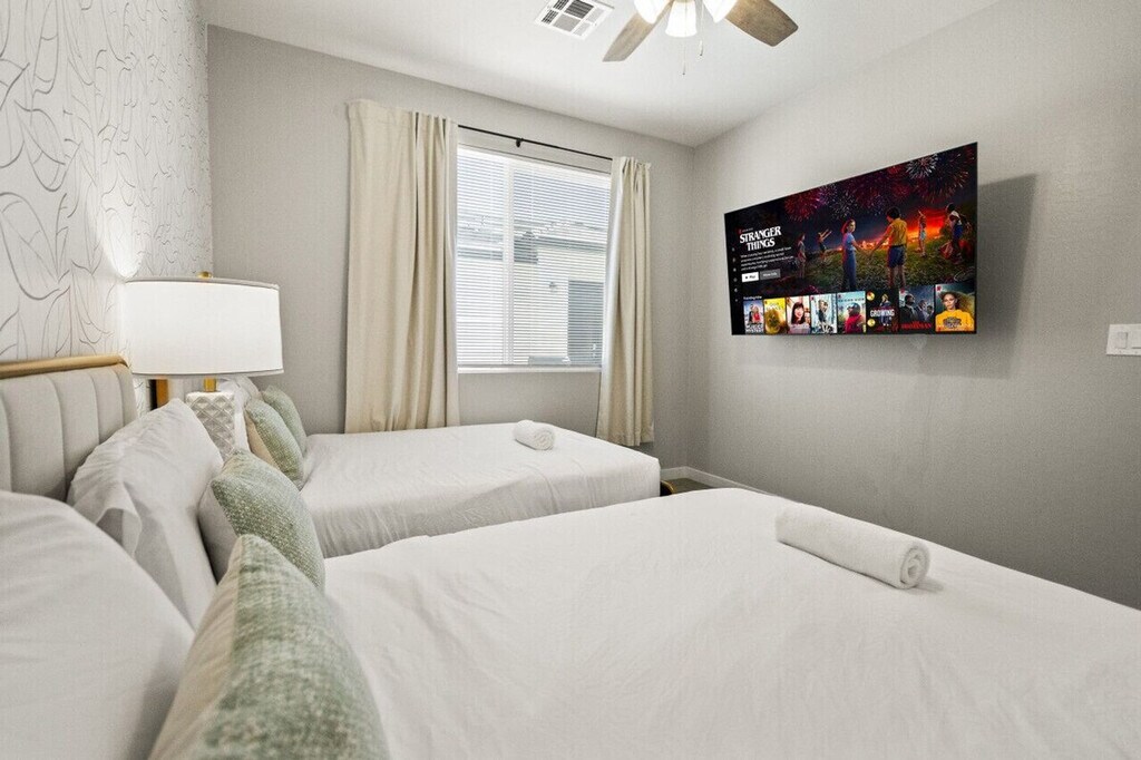 Feel at home in this modern 2-bedroom, 2-bathroom apartment in Glendale. This stylish space offers comfort and convenience. Enjoy a stylish, spacious retreat with a dreamy king-size bed. This beautifully curated apartment features an open-concept living and dining area with wood accents and contemporary finishes. The kitchen is fully stocked with a stove, oven, fridge, microwave, dishwasher, coffee maker with coffee essentials, toaster, kettle, full dinnerware, cookware, and baking trays. The bathrooms are well-equipped with a shower, bathtub, toilet, sink, mirror, towels, hairdryer, and essential toiletries. Rest easy with plush bedding, black-out curtains, and quality amenities across both bedrooms and living spaces. There is a 70" 4K smart TV in the living room, a king-size bed with a 55" HDR smart TV, and two full beds with 60" HDR smart TVs. An air mattress is available. Includes a foldable crib, shelf space, reading lamps, full blackout curtains, an ironing set, and an in-unit washer and dryer. Free on-site parking and high-speed Wi-Fi are included. This apartment is centrally located minutes from Westgate, Topgolf, shopping, and dining and close to State Farm Stadium for NFL games, concerts, and events. Enjoy quick access to major highways. A Minut noise monitoring device is in the unit. Interior photos represent the layout and style. Individual units may vary slightly in furnishings or orientation. Essentials are provided including towels, shampoo, conditioner, soap, and dishwashing essentials. These items are supplied in a starter quantity only and are not unlimited. Additional towels can be arranged upon request in advance. Toiletries and other consumable supplies are provided as a one-time set-up at check-in. Refills or replacements are not offered during the stay. [SI]