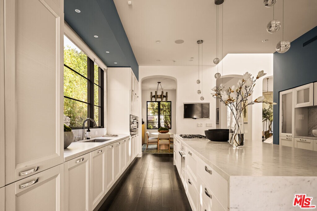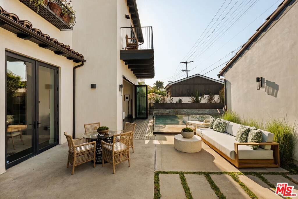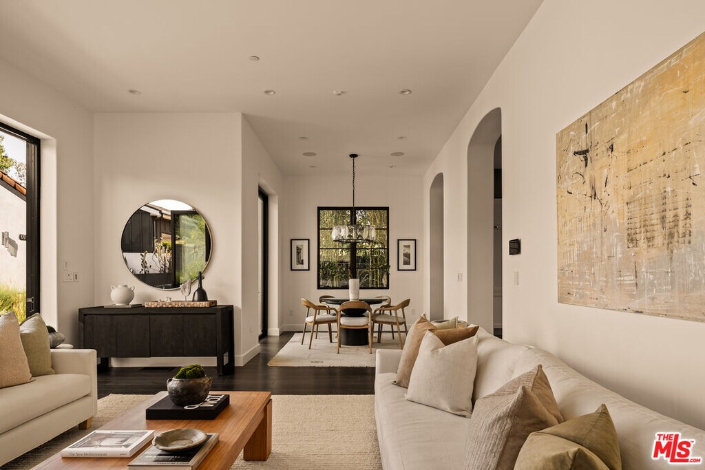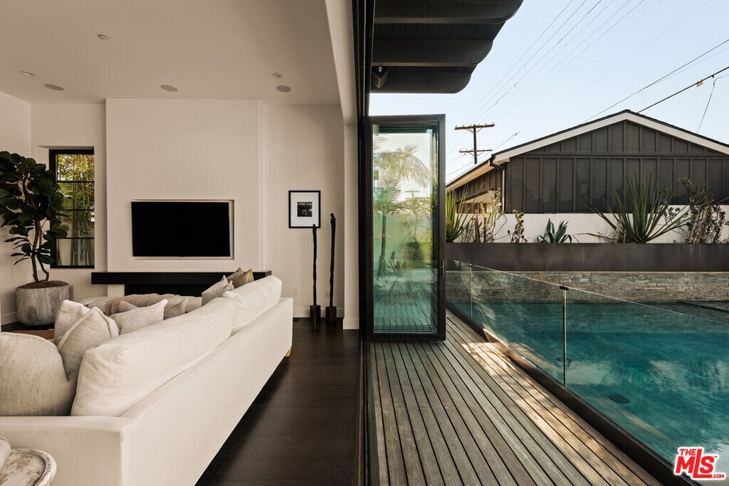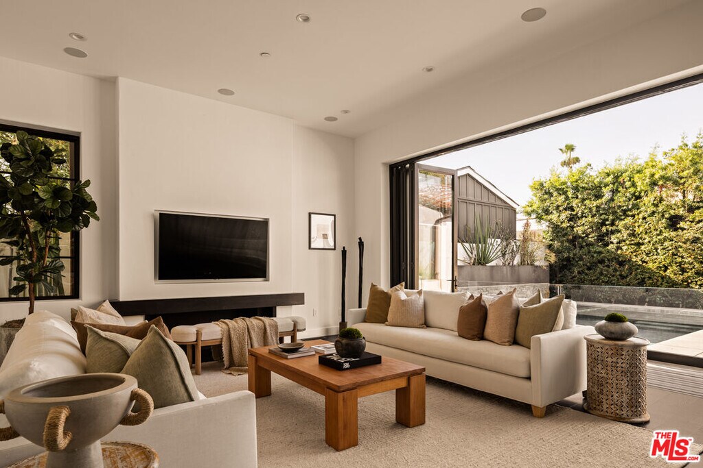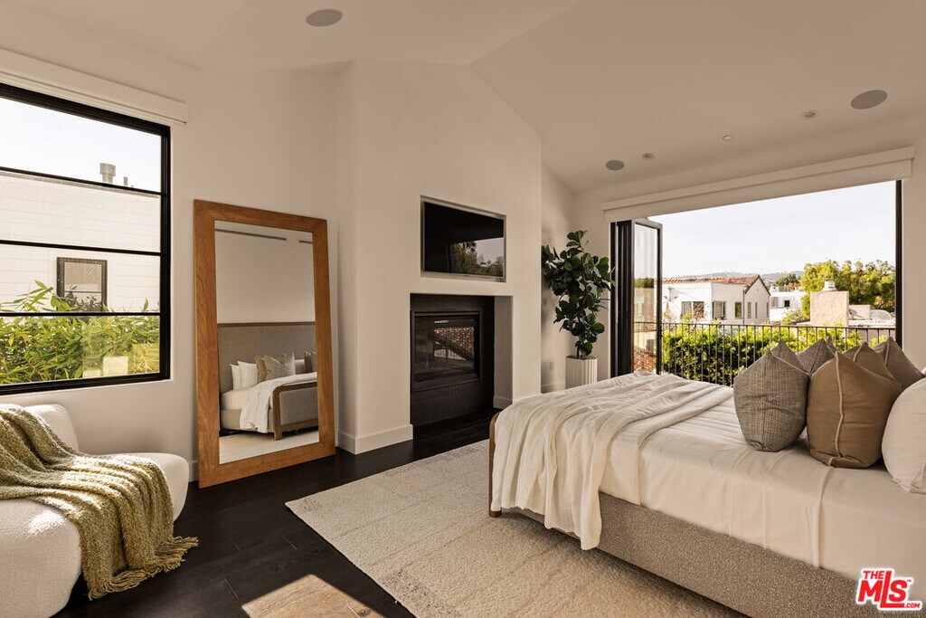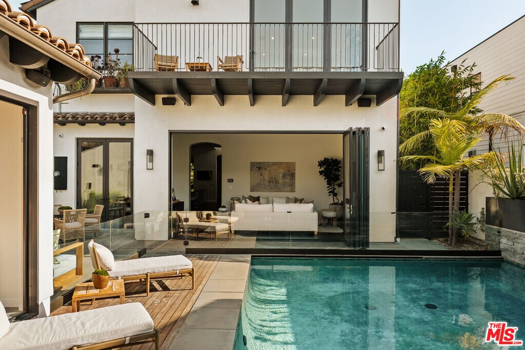 Tucked away on a coveted street in prime Beverly Grove, this Spanish inspired contemporary offers timeless character blended with modern comforts. Behind a gated entry, the 5 bedroom, 4.5 bathroom residence includes a newly built ADU ideal for guests, work from home, or additional income. A dramatic arched front door opens into a thoughtfully designed floor plan, where soaring ceilings, rich mahogany toned wood floors, and curated designer finishes echo the home's architectural roots. The formal living room features a statement fireplace, custom inlaid tile, and a storybook window that floods the space with natural light. The chef's kitchen is outfitted with Miele appliances, a marble waterfall island, and custom cabinetry, seamlessly connecting to an open-concept dining and family room. Additional luxuries include integrated speakers throughout, and a home security system. Floor to ceiling glass doors create a seamless indoor-outdoor flow to the private backyard oasis complete with a sparkling pool, spa, and lounge-ready patio. Professionally landscaped, the yard offers numerous upgrades such as custom pool lighting and recently installed safety fencing. Upstairs, the expansive primary suite offers a fireplace, private terrace with views of the Hollywood Hills, automated black-out blinds and a spa-inspired bath. Two additional upstairs bedrooms share a stylish Jack-and-Jill bath, while a guest suite downstairs offers privacy and flexibility. The ADU features a full kitchen and bathroom, ideal as a guest house, studio, or rental opportunity. Perfectly positioned in one of Los Angeles' most refined and walkable enclaves, this residence offers seamless access to nearby Melrose Avenue, The Grove, and the Beverly Center, along with a curated array of renowned restaurants, boutique shopping, and cultural landmarks. A rare offering that blends architectural character with an address defined by both elegance and ease. MLS# 25608775