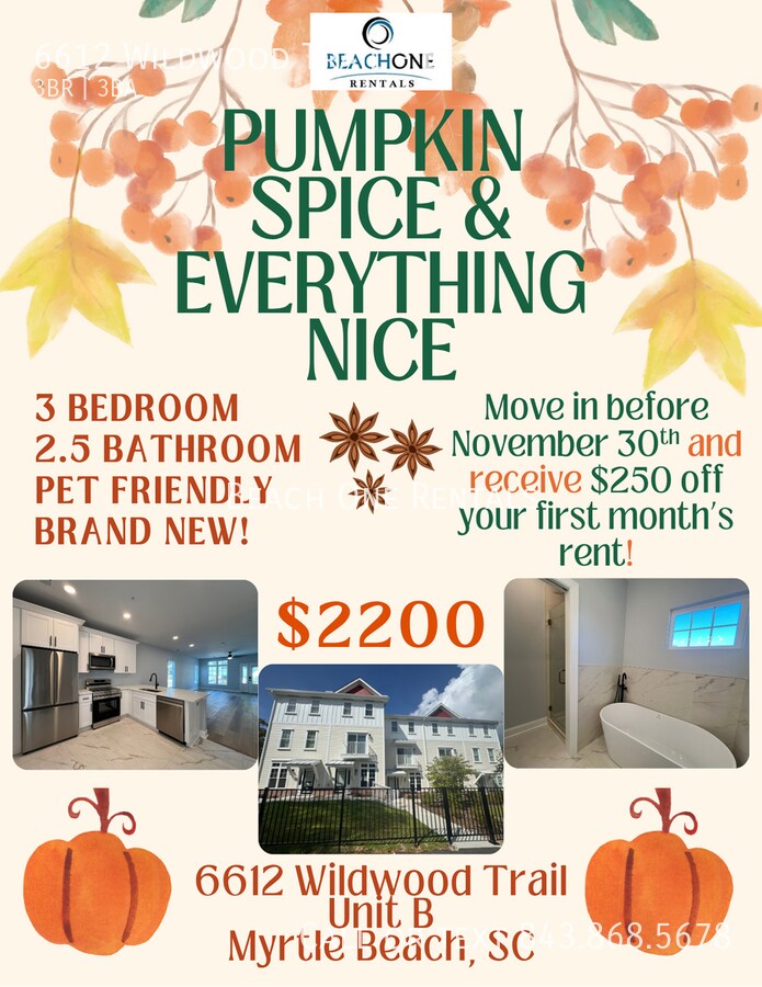 **Pumpkin Spice & Everything Nice...Including this Move In Special** Receive $250 off your first month's rent when you move in before November 30th! Introducing a brand new 3-bedroom, 2.5-bathroom townhome in the heart of Myrtle Beach, SC. This three-story unit boasts modern stainless steel appliances, sleek solid surface countertops, and a full-size washer and dryer that will make laundry a breeze. Enjoy the added bonus of a second-floor office area, perfect for those who work from home or need a quiet space to focus. The master bedroom is equipped with a small balcony. Don't miss out on this opportunity to live in a modern and functional new construction townhome, less than a mile from the beach. Basic cable and WiFi included. Tenant responsible for utilities and renters insurance. Dogs allowed. Cats considered on a case by case basis. Annual lease required. Resident Benefits Package (RBP) Available! Application Fee: $50 per adult -- For more details, please visit our website at **All residents have the option to be enrolled in our exclusive Resident Benefits Package, which includes liability insurance, credit building to help boost your credit score with timely rent payments, identity theft protection, HVAC air filter delivery (where applicable), a move-in concierge service for seamless utility setup, a top-tier resident rewards program, on-demand pest control, and more! Contact our office for more details!** None