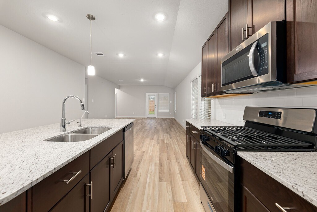 Beautiful 4-bedroom,3-bath single-story in Glendale Lakes with 2,012 sqft of thoughtfully designed living space. Features an open and airy family room,dedicated home office,and a stylish kitchen with espresso cabinetry,cream/black granite counters,white backsplash,island,and walk-in pantry. Light EVP flooring throughout main areas and plush multi-tone carpet in bedrooms. The spacious primary suite offers comfort and privacy. Built with high-performance energy-efficient features: spray-foam insulation,tankless water heater,Energy Star appliances,low-E windows,LED lighting,and high-efficiency HVAC. Exterior includes brick/stone elevation,covered patio,fenced backyard,double-wide driveway,and a 2-car attached garage. Located in Fort Bend ISD with convenient access to dining,retail,the Medical Center,Galleria,Pearland,and Hobby Airport. Perfect blend of modern design,comfort,and energy savings. MLS# 37329657