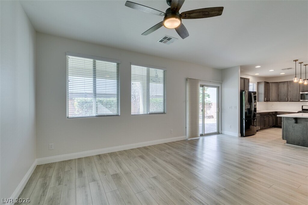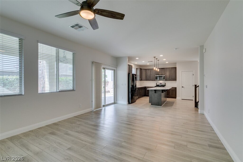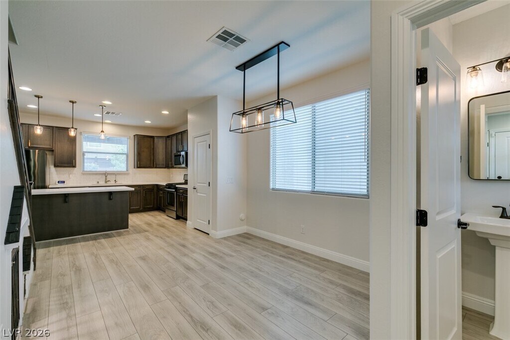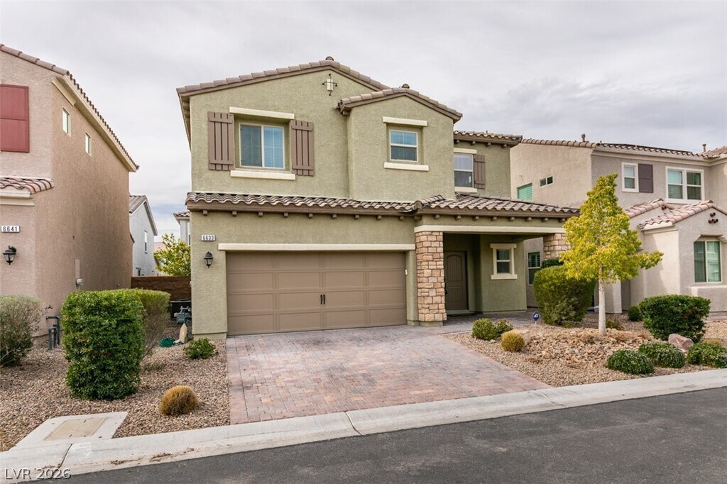 Welcome to this beautifully designed 3-bedroom, 2.5-bath home in the desirable 89148 area of Las Vegas. Step inside to a welcoming space ideal for a formal dining area that seamlessly flows into the open-concept kitchen and living room. The kitchen features a generous island for added counter space and stainless steel appliances, perfect for everyday living and entertaining. A sliding door off the living room leads to a spacious backyard with a covered patio, pavers, and endless potential. Upstairs, you’ll find light-filled bedrooms, including a private primary suite with dual sinks, ample counter space, a walk-in shower, and a separate soaking tub. The community also offers a pool and playground for added enjoyment.