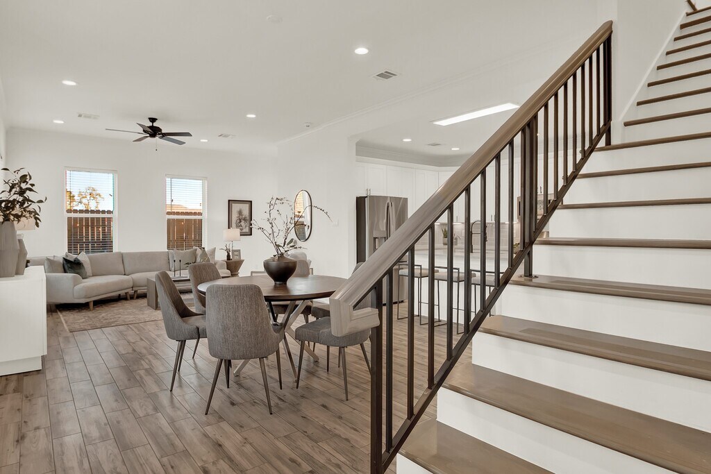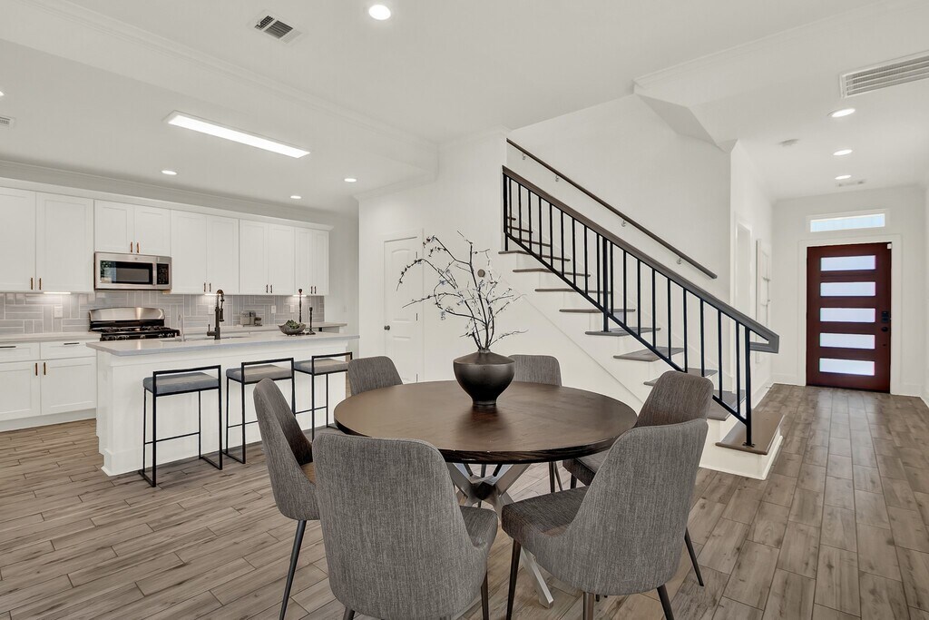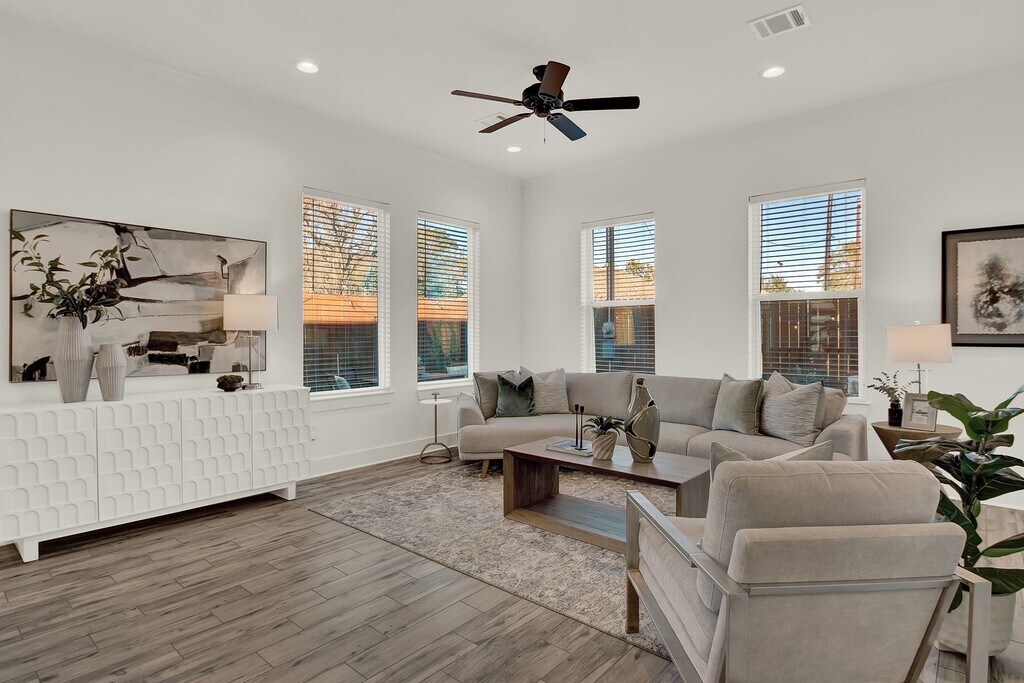 Located in a residential community on a larger corner lot,this two-story home offers expanded yard space and natural light from multiple exposures. The first floor features an open living,dining,and kitchen area with wide windows,quartz countertops,stainless steel appliances,soft-close drawers,ample cabinetry,and an island. A half bath is also on this level. Upstairs includes well-sized bedrooms,full bathrooms including a primary en-suite,and generous closets. A game room with an integrated media screen system offers additional flexible space,with extra windows benefiting from the corner positioning. An attached garage,private driveway,and fenced outdoor area with built-in planters and a patio provide usable exterior space. A whole-home water filtration system is included. Positioned along the community’s single internal street with physical proximity to I-45,610,and 290 for convenient access. A beautiful home designed for space,light,and modern living. MLS# 13900264