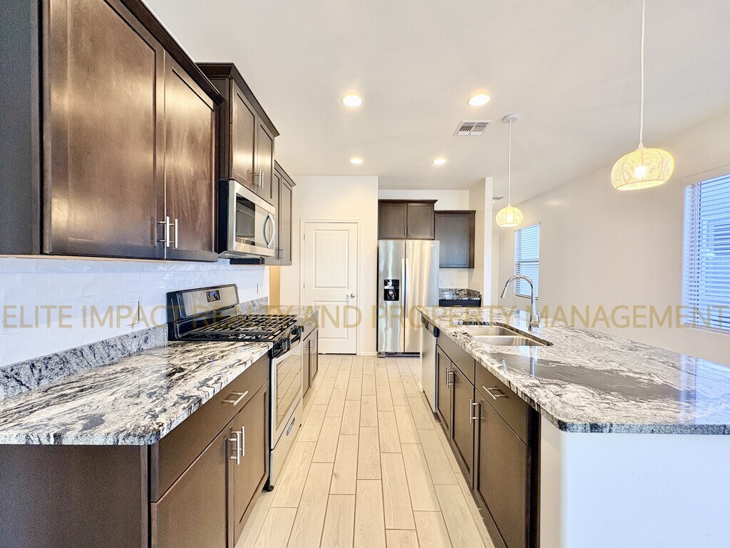 Home Sweet Home! This immaculate 3bed/2bath + Den/Office space is what you've been looking for! Conveniently located off Wilmot and I-10 in the beautiful La Estancia community. Close to DM, Raytheon, Amazon, and in the Vail School District, this home has it all! Light and airy open floor plan has great room with beautiful kitchen complete with large island, Stainless Steel appliances, gas range, pantry, and plenty of cabinet and counter space. Spacious den/office off entryway that includes a closet. Large primary bedroom includes bathroom with dual vanities, walk-in shower, and large walk-in closet. 2nd and 3rd bedrooms are roomy too with already painted accent walls! Laundry room with w/d included as convenience. Block fence back yard with covered patio and turf for easy care. Pet Friendly. Enjoy the La Estancia master planned community with pool, and parks throughout! Call/text or email for showings now!