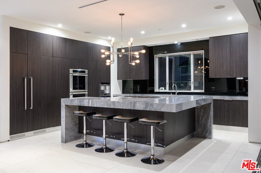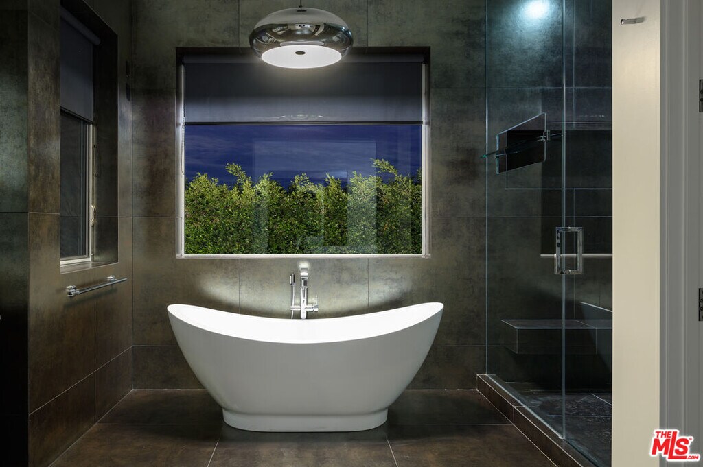 Indoor and outdoor living merge gracefully into one at this modern Beverly Grove Villa. Privacy abounds at this Smart Home beyond the gated entrance with tall foliage. The home showcases several beautiful living spaces and 5 bedroom suites each with their own private patios. The modern interior is bathed in natural light throughout. The dramatic two-story living room is bright, open and inviting with the vertical fireplace reaching up to the second level. The chef's kitchen with top of the line appliances and a waterfall island offers views of the pool, spa and grass area through the walls of glass that vanish. A floating staircase leads upstairs to the bedroom sanctuaries. The primary suite showcases a stunning fireplace, luxurious bathroom with a frameless glass shower and soaking tub, and a spacious walk in closet. MLS# 25627675