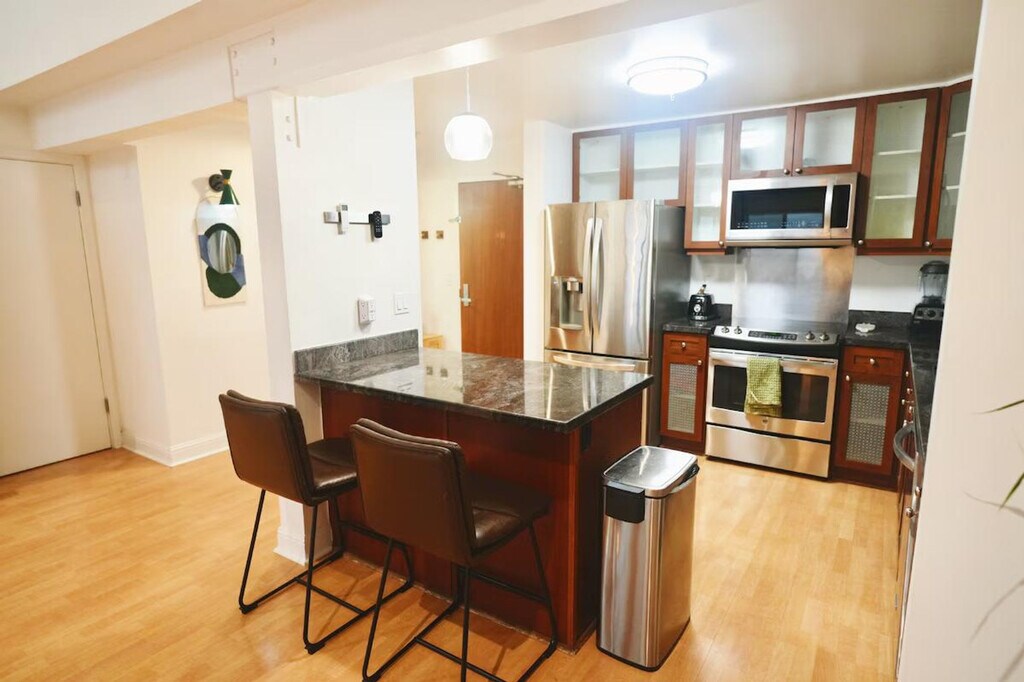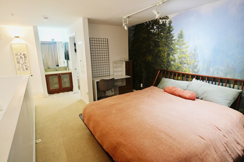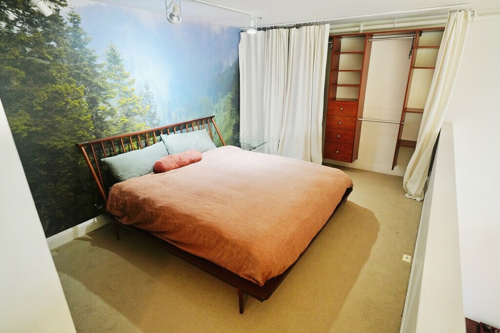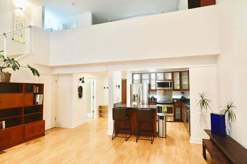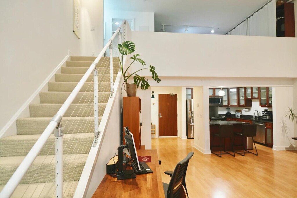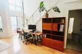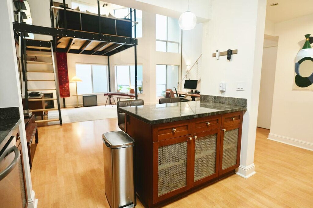 Experience iconic loft living in this San Francisco retreat with soaring ceilings. Feel at home in this space that's ideal for artists, couples, and design lovers seeking comfort, light, and creative energy. Enjoy a musical stay with an E piano, Guzheng, and vinyl player in a naturally resonant space. This apartment includes two full baths with Japanese bidets, an oversized chef’s kitchen with espresso machine, mid-century Danish furniture, and a cute patio. The loft bedroom features a king-size bed, and there is also a lounge pit/king-size bed in the open mezzanine. [SI]