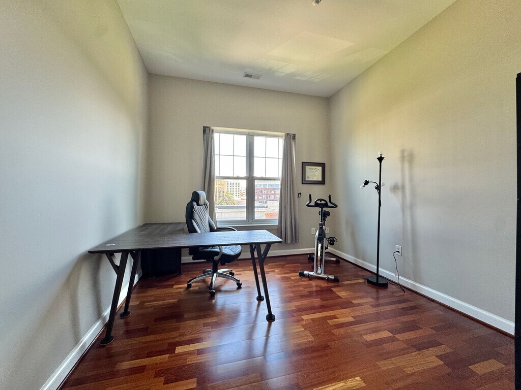 Step into luxury urban living in the heart of Newport News with this stunning 1-bedroom plus flex room/office/study, 1.5-bath condo located in the prestigious mixed-use community of The Point at City Center. This residence is perfectly positioned on 4th floor with elevator access, for those who wish to combine refined living with work-and-play convenience. Airy 13-foot ceilings create an expansive and airy ambiance. Cherry hardwood floors flow throughout the main living areas. Large windows and a private balcony frame views of the cityscape. The kitchen features modern sleek cabinetry, and plenty of counterspace. Office/Study adds addition flex room. The huge primary bedroom offers a tranquil haven, with full bath, while half-bath serves guestsGarage parking space (one included) adds to the ease of urban living. Located within the vibrant City Center at Oyster Point district, this residence places you in a lifestyle-rich setting. A landscaped fountain park anchors the neighborhood, surrounded by restaurants, cafés, specialty shops and a dynamic business hub. Community amenities include fitness rooms, clubhouse spaces, business center, and pool/outdoor social areas, making this more than just a home—it’s a full-service living environment. Close to premiere dining, retail, and social gathering spots right in your backyard. Easy access to major employment hubs and military bases. Great location for commuters. Agent compensation 25% of one months rent