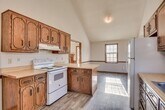 Stucco/ siding ranch with cathedral ceilings,eat in kitchen,deck and huge backyard.