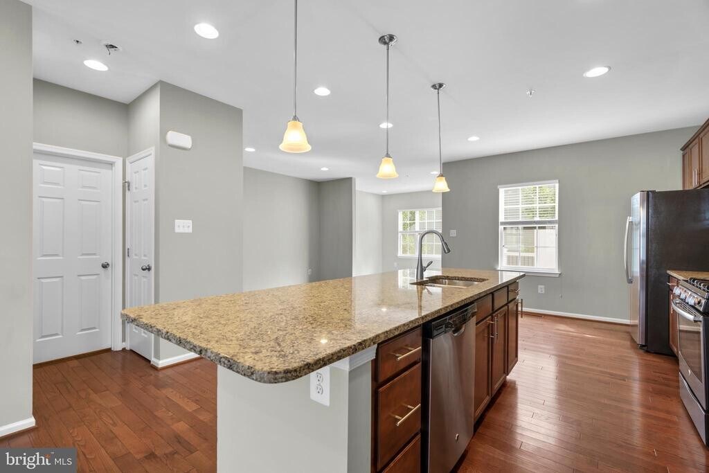 Sought after end-of-group townhome located in Simpson Mill featuring a 3 bedroom, 2.5 bath and 2 car garage ready for you! Open floor plan with rich hardwoods. The kitchen is equipped with stainless steel appliances, granite counters, diagonal tile backsplash, pendant lighting, and an island with a dual sink, perfect for the gourmet in you. Breakfast area opens to Trex deck that has a partition for privacy. Upper level owner's suite offers a vaulted ceiling, a walk-in closet and garden bath featuring dual vanities, soaking tub, glass enclosed shower. Two additional spacious bedrooms, full bath, and the laundry area. Enjoy down time in the lower level rec room with fresh carpeting and a storage area. Close to Rt 32, Rt 29, & I-95.