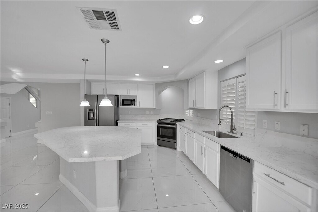 Discover this beautifully upgraded home with 4 bedrooms plus 2 flexible lofts perfect for office, playroom, theatre or guest suite. The primary bedroom boasts a fabulous walk-in closet. Enjoy an open floor plan with a spacious living room, modern kitchen featuring white quartz countertops, matching cabinets, and a walk-in pantry including refrigerator, stove, and dishwasher. Fresh paint throughout and fully renovated bathrooms showcase a clean, contemporary style with white porcelain tile flooring. The backyard is perfect for outdoor gatherings. Conveniently located in the heart of Southwest Las Vegas, near freeways 215, dining, and shopping, with easy access to the Strip and highways. A must-see! Tenant is responsible for monthly sewer & trash fee. Furniture is an option for lease to buy with an additional charge.