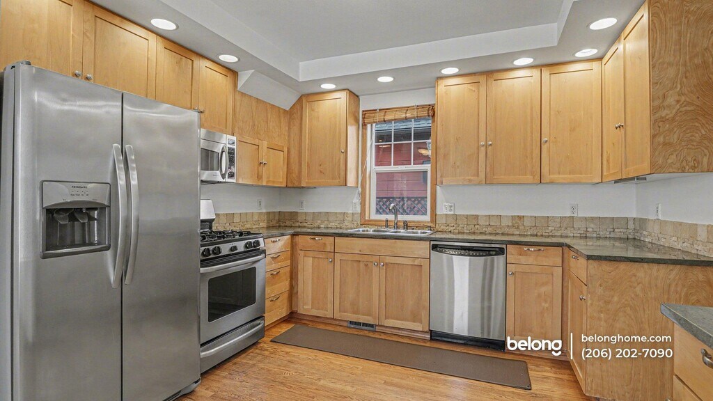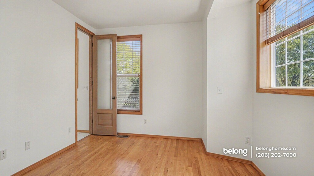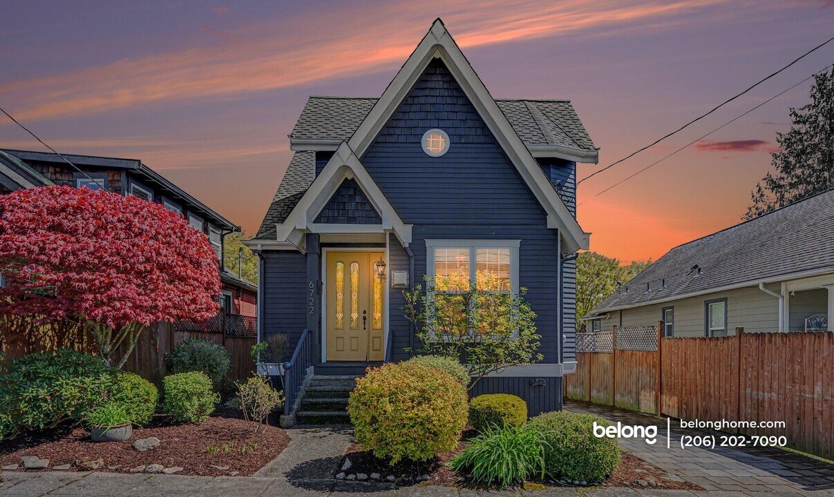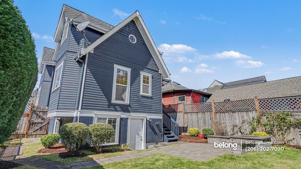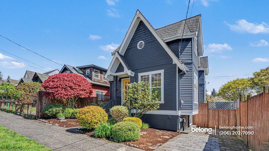 Character and craftsmanship meet modern livability in this storybook three-bedroom home, where steep gables, a deep navy exterior, and distinctive architectural details create a striking first impression. Mature landscaping and a vibrant Japanese maple frame the entry, lending standout curb appeal on a quiet residential street. Inside, gleaming hardwood floors and crisp white walls set a bright, welcoming tone throughout the main living areas. Oversized windows draw in abundant natural light, while warm wood trim adds a layer of classic charm. The open living and dining spaces flow effortlessly, with a rear door leading outside for easy indoor-outdoor transitions. A convenient half bath completes the main level. Upstairs, the bedrooms feature soft carpeting, vaulted ceilings, and thoughtful architectural touches, including a charming porthole window. Generous closet space and a versatile family room offer flexibility for work, rest, or hobbies. Two full bathrooms include a tiled tub-shower combination and a separate walk-in shower for added convenience. Outside, a fenced backyard and private side driveway deliver everyday ease. Tucked into a lively, walkable pocket of northwest Seattle, this home places you near parks, local shops, and the vibrant energy that defines the area, with quick connections to everything the city has to offer. *Our homes come as-is with all essentials in working order. Want upgrades? Request it through the Belong app, and our trusted pros will take care of the rest!