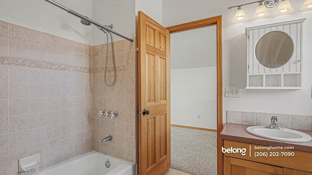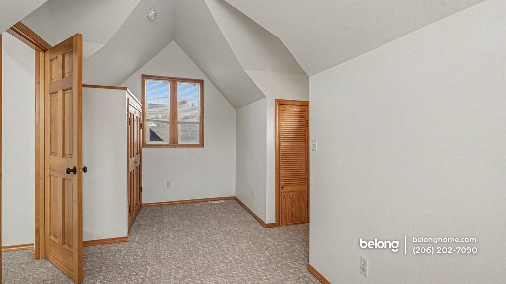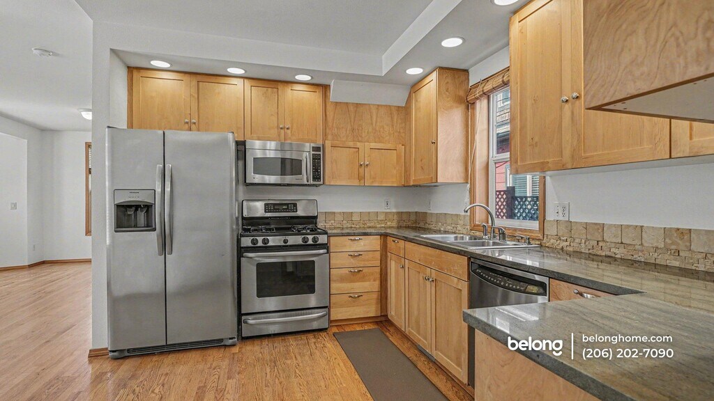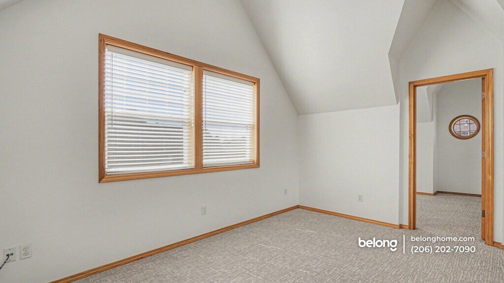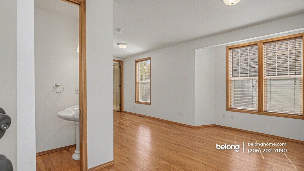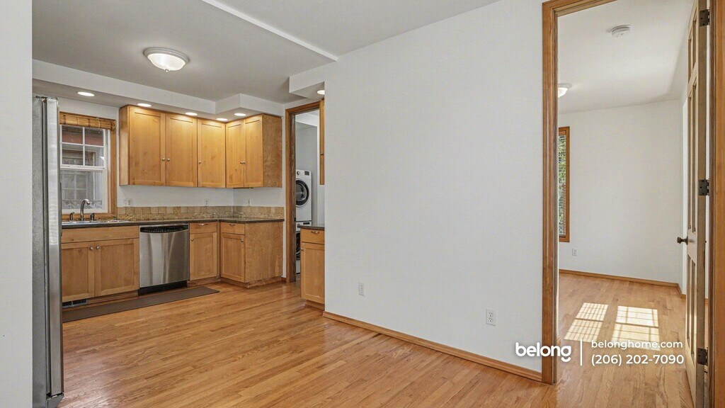 Character and craftsmanship meet modern livability in this storybook three-bedroom home, where steep gables, a deep navy exterior, and distinctive architectural details create a striking first impression. Mature landscaping and a vibrant Japanese maple frame the entry, lending standout curb appeal on a quiet residential street. Inside, gleaming hardwood floors and crisp white walls set a bright, welcoming tone throughout the main living areas. Oversized windows draw in abundant natural light, while warm wood trim adds a layer of classic charm. The open living and dining spaces flow effortlessly, with a rear door leading outside for easy indoor-outdoor transitions. A convenient half bath completes the main level. Upstairs, the bedrooms feature soft carpeting, vaulted ceilings, and thoughtful architectural touches, including a charming porthole window. Generous closet space and a versatile family room offer flexibility for work, rest, or hobbies. Two full bathrooms include a tiled tub-shower combination and a separate walk-in shower for added convenience. Outside, a fenced backyard and private side driveway deliver everyday ease. Tucked into a lively, walkable pocket of northwest Seattle, this home places you near parks, local shops, and the vibrant energy that defines the area, with quick connections to everything the city has to offer. *Our homes come as-is with all essentials in working order. Want upgrades? Request it through the Belong app, and our trusted pros will take care of the rest!
