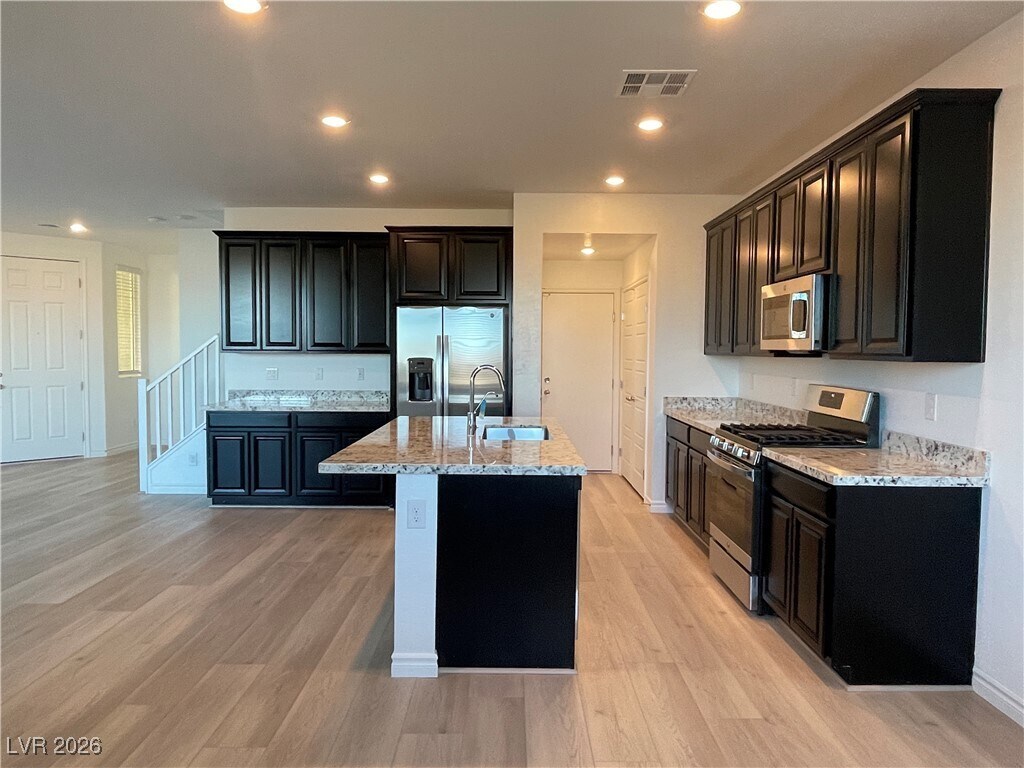 4 Bedroom Lennar Home in Sunrise Mountain! Solar, Sewer and Trash Included in Rent!! PIMARY BEDROOM on the second floor and ANOTHER BEDROOM downstairs - One on First Floor and One on Second Floor! Bedroom Downstairs has Bathroom. Primary Bedroom on Second Floor with sliding door to Balcony overlooking the mountains. Primary bath has separate Shower and Tub, Dual Closets and Dual Sinks. Second and Third Bedroom Upstairs share a Jack and Jill Bathroom! Kitchen has Granite Countertops with Java Espresso Cabinets and Stainless Steel Appliances. Luxury Vinyl Plank and Carpet Flooring! Low Maintenance Backyard with covered Patio! Be the first to live in this property!