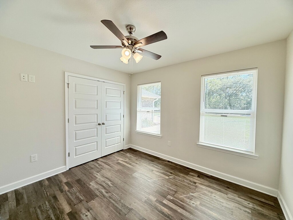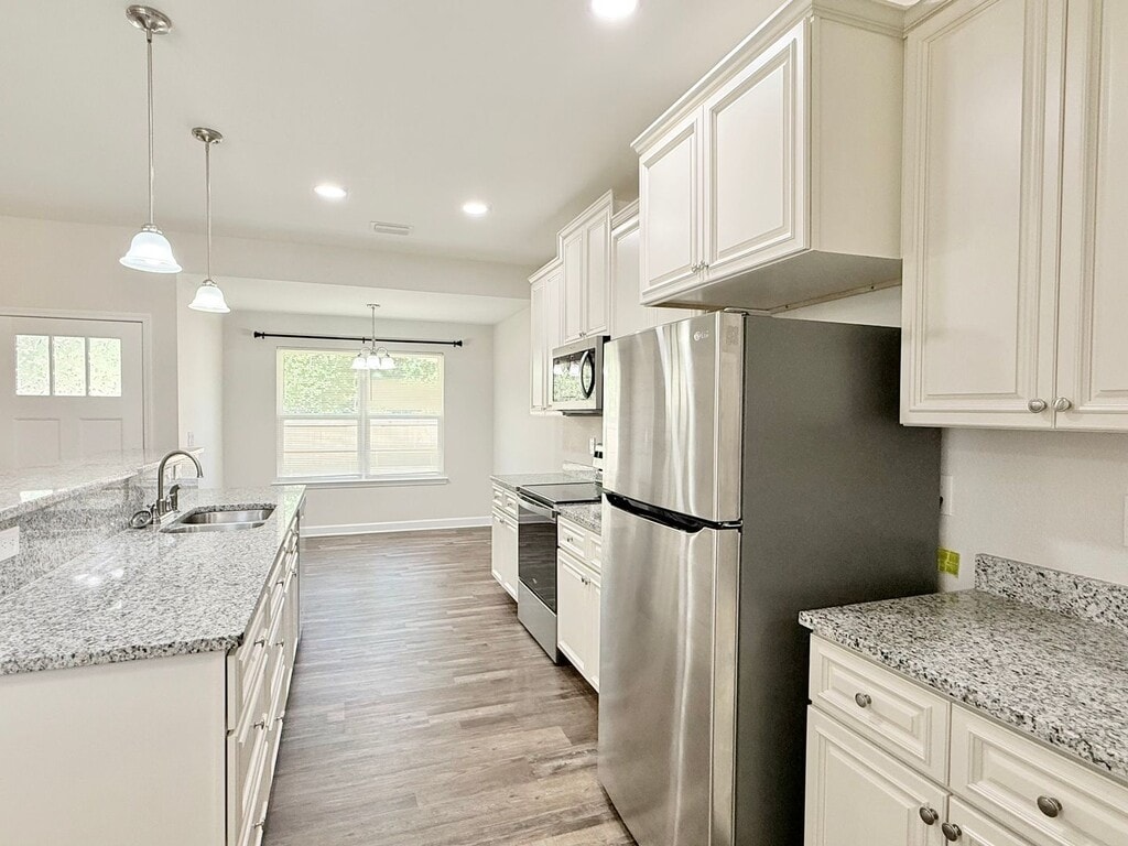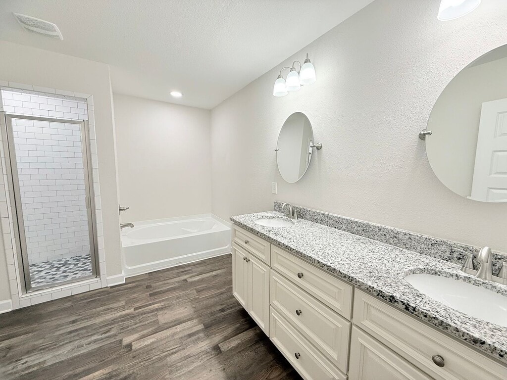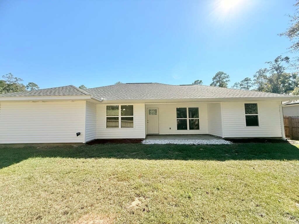 View in 3D: This thoughtfully designed 3-bedroom, 2-bath home offers an open, split-bedroom layout that’s perfect for families or hosting guests. The welcoming foyer leads into the spacious family room, which then flows seamlessly into the kitchen and dining areas. The kitchen is a true highlight, featuring granite countertops, abundant cabinet storage, a double-basin sink, and stainless steel appliances. Additionally, a breakfast bar provides casual seating, while the dining area offers space for both everyday meals and formal gatherings. The primary suite includes a walk-in closet and a luxurious ensuite bath with dual vanities, a garden tub, separate shower, ceiling fan, and a private water closet. Two additional bedrooms each feature double closets and ceiling fans, and share a second full bath with single vanity and tub/shower combo. Additional highlights include a mudroom with storage closet connecting the home to the 2-car garage, a spacious laundry/utility room with space for a full size washer/dryer, a covered back porch, and a fully-fenced backyard.