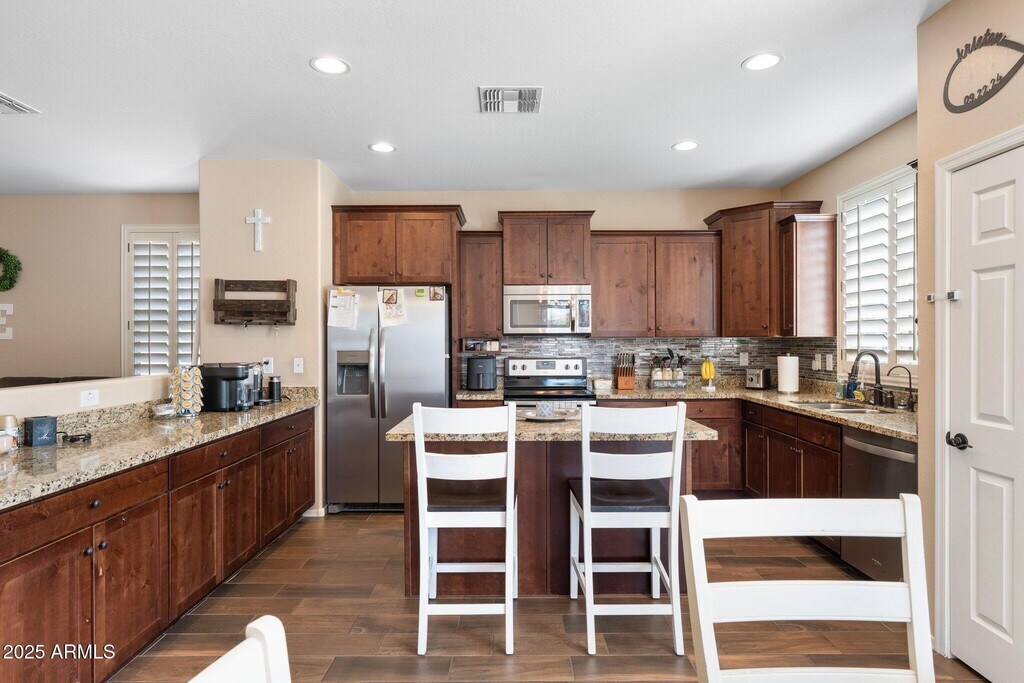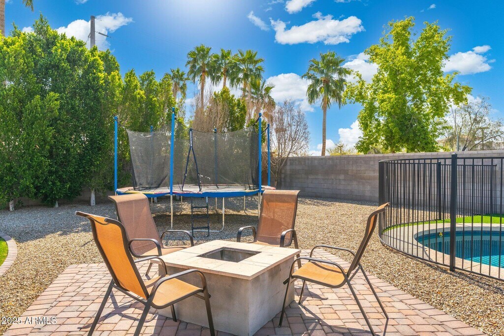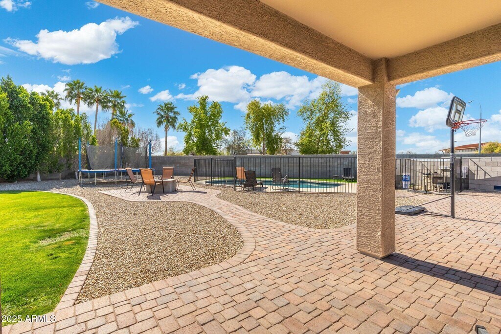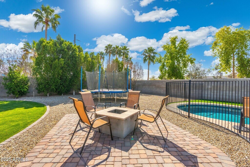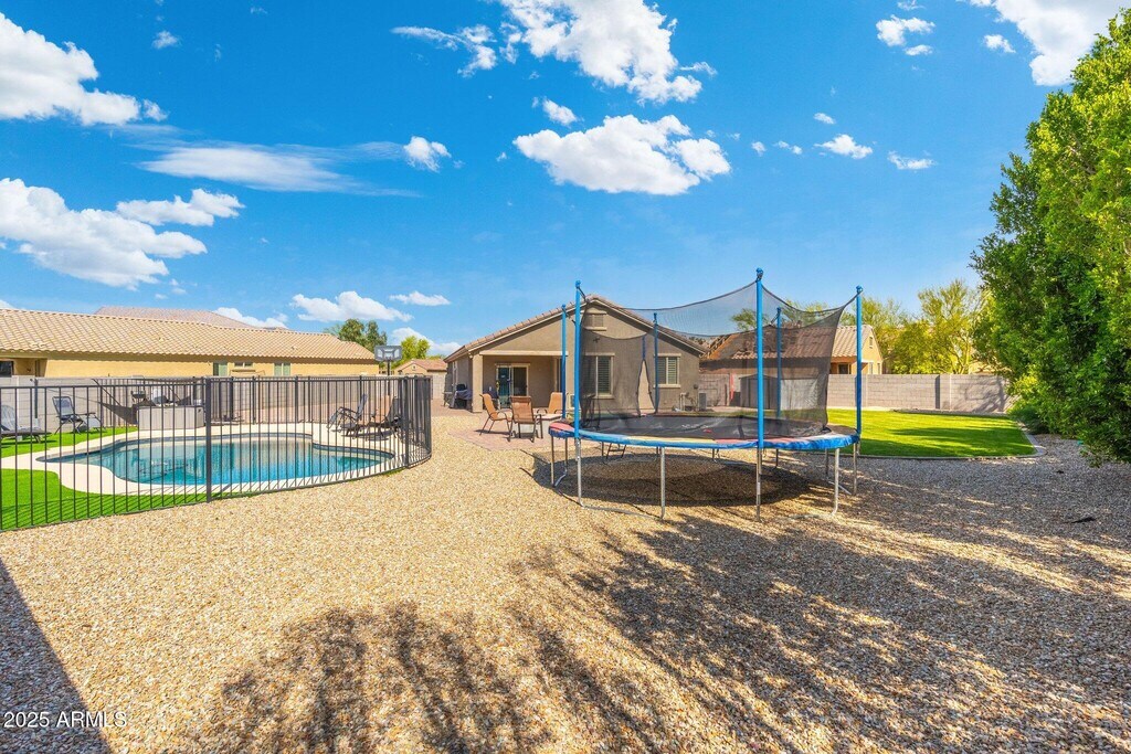 Welcome to Peoria Village! Beautiful 4 bed,2 bath home on over 1/4 acre huge grass play yard,plus a fenced pool! Upgraded wood plank tile throughout,shaker cabinets,granite countertops,tile backsplash,Stainless appliances,plantation shutters on all windows,double sinks in both bathrooms,master bath includes garden tub,separate shower,private toilet room. Pool is less than 5 years old with 10 year warranty and has been professionally maintained. Home features soft water system. New water heater installed '22. Epoxy garage floor,custom shelving. Full irrigation system front and back. This home is beautifully upgraded and sits on the second largest lot in the neighborhood! Price includes monthly pool service and landscaping.