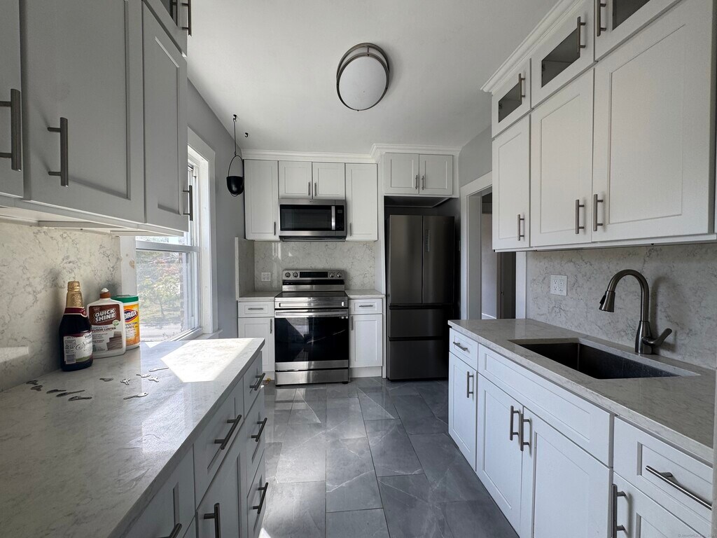 Call for Availability - Fireplace + Sunporch Charm, Fully Remodeled" Step into a beautifully updated apartment where timeless charm meets modern finishes. This 1,094 sq ft residence includes a formal living room with fireplace, separate dining room, and a remodeled kitchen with new cabinets, stone countertops, and stainless steel appliances (stove, refrigerator, microwave). A bright breakfast room and inviting sun porch add flexible space for working, reading, or morning coffee. Two bedrooms and a full bath complete the layout, while hardwood floors throughout add warmth and continuity. Outside, enjoy a fenced, level, tree-lined yard with professional landscaping-a rare outdoor setting for apartment living. Features also include a programmable thermostat, storm windows/doors, and access to an alarm system. Ideally located near Beardsley Park, Library, Hospital, tennis courts, and a public ice skating rink, with easy access to I-95, Routes 8 & 25, and the Merritt Parkway. Less than 1 mile to the ferry to Port Jefferson, NY, and a public transportation bus stop is just one block away for added commuter convenience. Rent: $2,200/month. Showings via ShowingTime only. Credit reports + proof of income required. MLS# 24134377