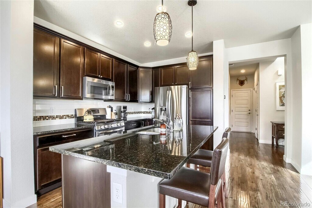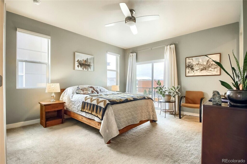 Modern end-unit townhome located in Denver’s newest urban community, offering abundant natural light with tons of windows and soaring nine-foot ceilings. This 3-bedroom, 3-bath home features 1,712 square feet of living space and high-end finishes throughout, including a gourmet kitchen with slab granite center island, custom tile backsplash, and stainless steel appliances. Freshly updated with new paint and A/C. The spacious main level includes a great room with fireplace and a large covered patio, perfect for relaxing or entertaining. The spectacular primary bedroom offers double-door entry, a private balcony, a five-piece en-suite bathroom, and a walk-in closet. A convenient laundry and mudroom includes a high-efficiency washer and dryer. Residents enjoy a true neighborhood feel while being close to Downtown Denver, the light rail system, I-36, and I-25. Walk to a brewery, dog park, bakery, and a lush green park with a water feature. Located in Midtown, just 10 minutes from LoDo and LoHi.