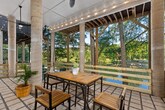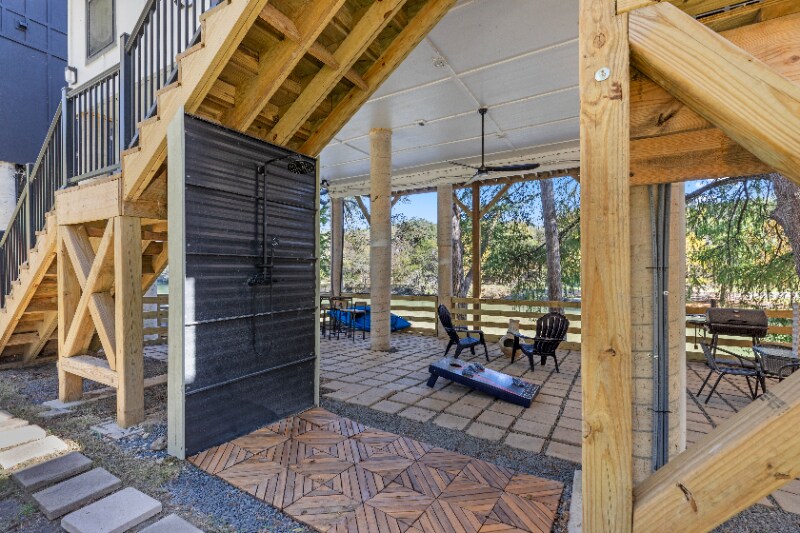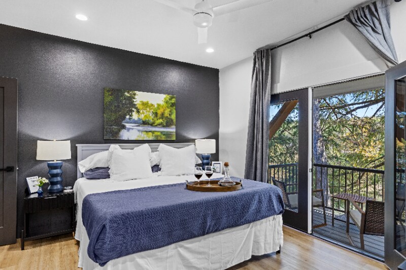 Property Id: 2185393 Escape to Weißes Chateau, a serene 3-story treehouse cabin on the Guadalupe River. This 4-bedroom, 3-bath haven sleeps up to 11 guests and blends modern design with natural beauty. The king master suite features a private deck and river views, while two queen bedrooms and a game room with bunk beds offer comfort for all. Enjoy an open-concept living area with a quartz waterfall island, scenic dining space, and multiple decks—including one with an outdoor shower. Relax on the covered patio with a grill and games, or explore your private river access for tubing, paddleboarding, and floating. Located near downtown New Braunfels, Schlitterbahn, and Gruene. Fully furnished and available for 2 weeks to 6 months.