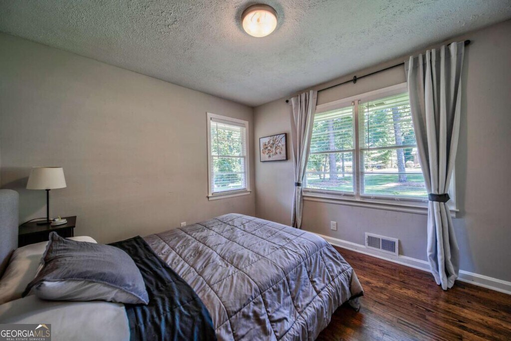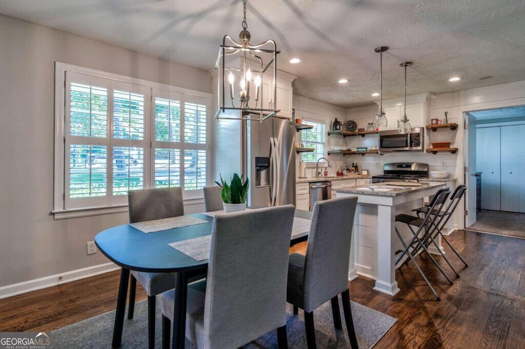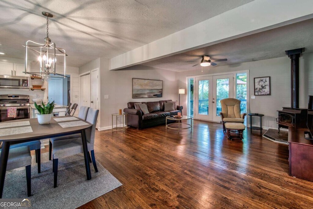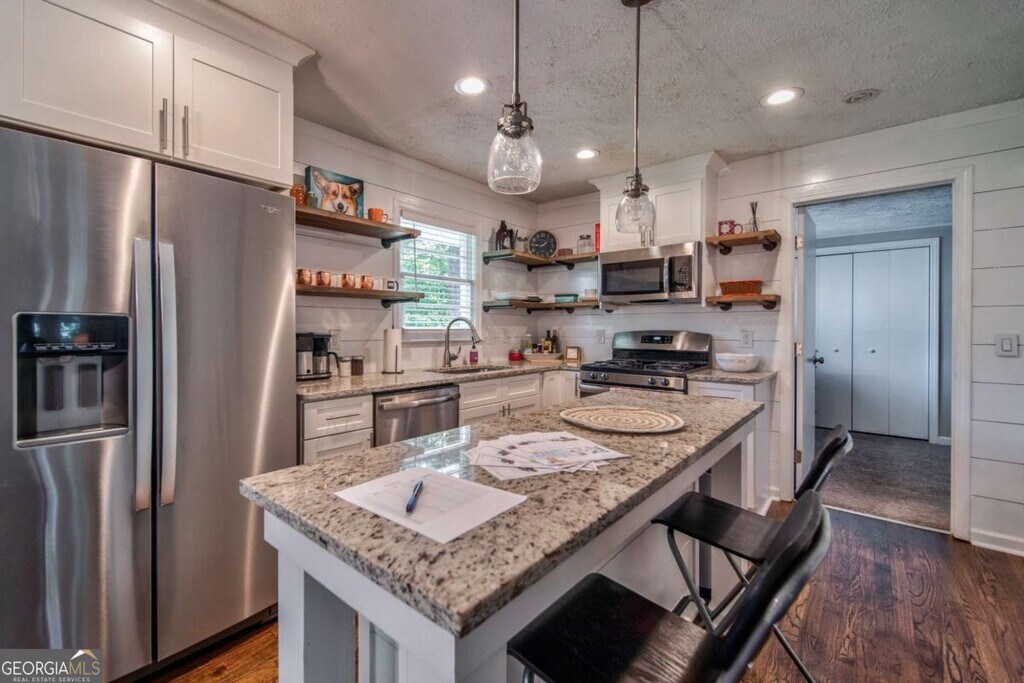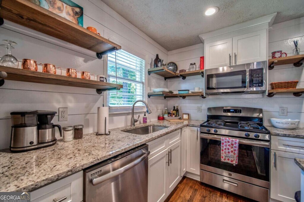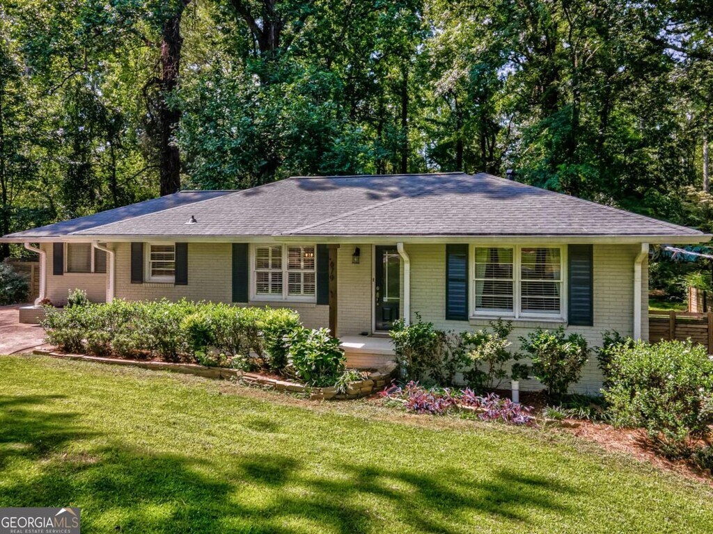 Fully renovated, four-sided brick mid-century ranch is situated on nearly 3/4 of an acre with a fenced yard, located in a quiet, well-established cul-de-sac neighborhood. Thoughtfully updated in 2020, this 3-bedroom, 2-bath home combines timeless character with modern conveniences. The single-level design offers minimal steps and an open, inviting floor plan. The primary suite features an ensuite bathroom, custom built-in closets, and ample natural light. The updated eat-in kitchen includes granite countertops and custom shelving, flowing seamlessly into the family room, where a wood-burning stove with a stone hearth provides a cozy focal point. Designer fixtures with dimmable lighting and custom finishes enhance the home's sophisticated appeal. French doors open to a spacious private deck and garden area, ideal for relaxation or entertaining. The backyard includes a large detached entertaining shed with a built-in brick BBQ, adding versatile outdoor living space. Additional highlights include a newer roof, updated systems, and modern electrical and plumbing. Available to lease fully furnished. Conveniently located just minutes from I-20, I-285, I-75, and Truist Park, this home offers easy access to the Silver Comet Trail, fitness centers, and a variety of grocery stores including Aldi, Lidl, Publix, and Kroger. Local amenities such as CVS, a hardware store, and emergency services are nearby.
