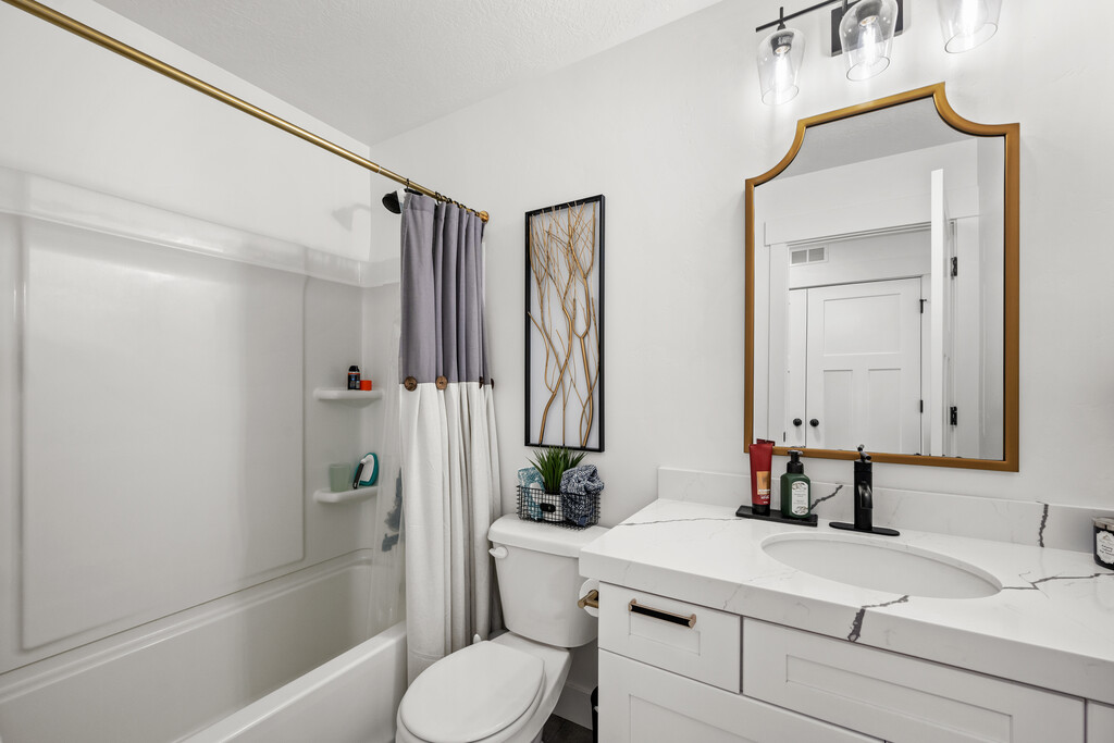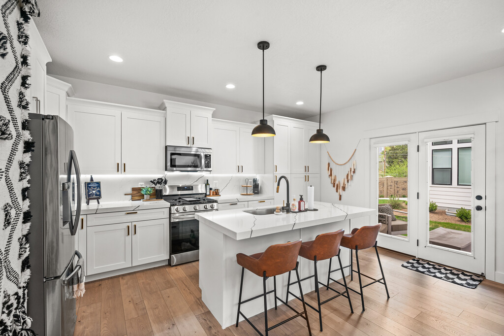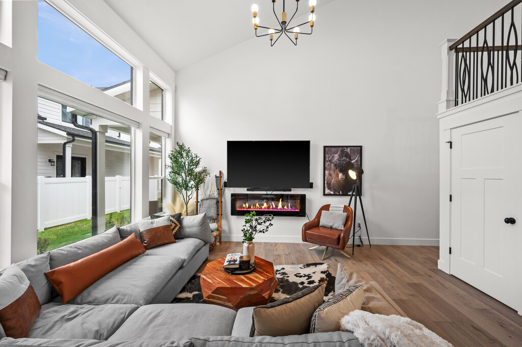 Stunning, fully furnished modern farm house town home! Stunning 5 CM quartz counter tops throughout paired with bright white cabinets, tiled baths, white walls, commercial grade laminate flooring, upgraded plush carpet with memory foam pad, stunning two one railing, modern black and gold fixtures, vaulted ceilings, large windows for amazing natural light, 9' main floor ceilings, covered patio, grand master bedroom with ensuite bath, which includes double sinks, separate tub/shower, & spacious walk in closet! Appliances include a brand new french door refrigerator, gas stainless appliances, water softener, washer/dryer! There is also a 240 outlet in garage to plug in an electrical vehicle, and so much more! You won't want to miss this! Hurry before it's gone! -Fully furnished down to the dish, kitchenware, towels, etc. One of the rooms has an in-home office as well (not shown)! -Renter must take care of snow removal. -HOA covers exterior maintenance. Owner covers monthly HOA payment -Renter must maintain active renter's insurance policy. -Renter must cover utilities. -Fridge, water softener, window coverings, & washer/dryer are included in rental agreement -No smoking -Two small pets allowed with a $300 nonrefundable pet fee pet pet. -Basement is unfinished.