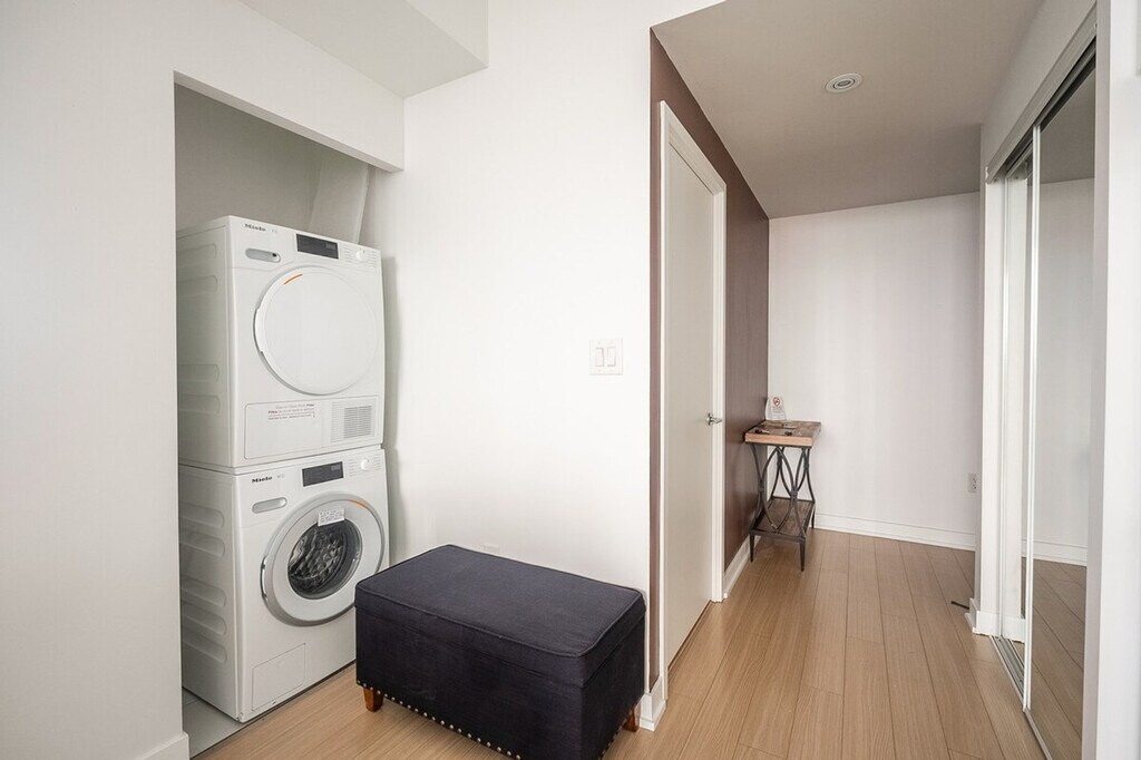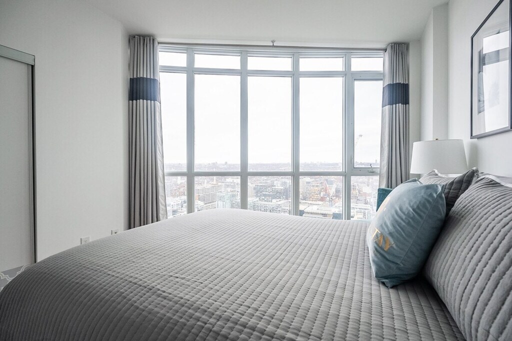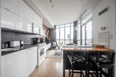 Feel at home in this stylish, cozy unit with a balcony in the heart of the downtown entertainment district, located on a high floor. This comfortable suite has everything you need to make you feel right at home, including a fully functional kitchen with tea, coffee, a kettle, a coffeemaker, and a toaster. There is also a washer and dryer with supplies, and a bathroom with towels, shampoo, conditioner, body wash, a hair dryer, and other toiletries. Paid underground parking with in/out privileges is available upon request for $20 per night. A travel crib (for babies 0-18 months) and bed rails are available for $5 per item per night. Pets are allowed for a fee of $10 per pet per night; confirm availability prior to booking. Enjoy easy access to the TTC, Union Station, Lake Shore, and the Gardiner Expressway. This centrally located apartment is steps away from the CN Tower, Rogers Centre, Union Metro Station, the Financial District, bars, restaurants, Sobeys Grocery Store, and Bishop Airport. Guests must be 18 or over to check in. According to the condo rules, information about guests must be provided to the condo management prior to arrival, including names and ID details, and vehicle and license plate numbers if parking is required. Guests whose names or ID do not match the information given are not allowed into the building. A selfie with your ID may be requested as an anti-fraud measure. [SI]