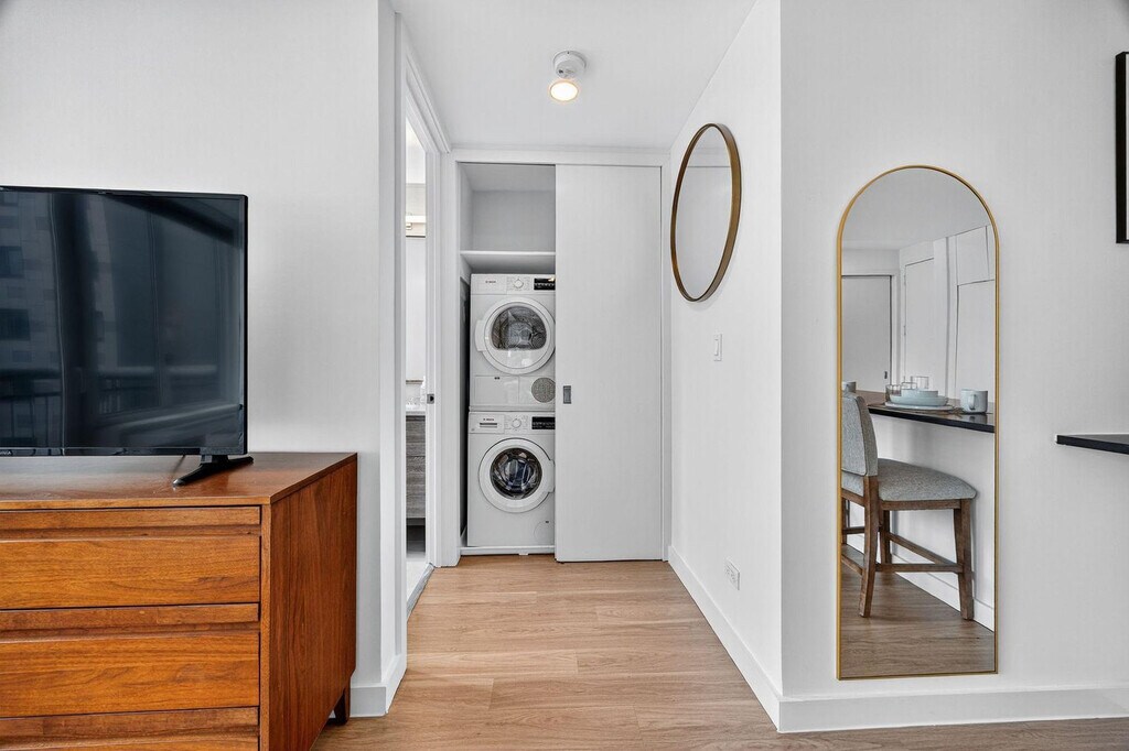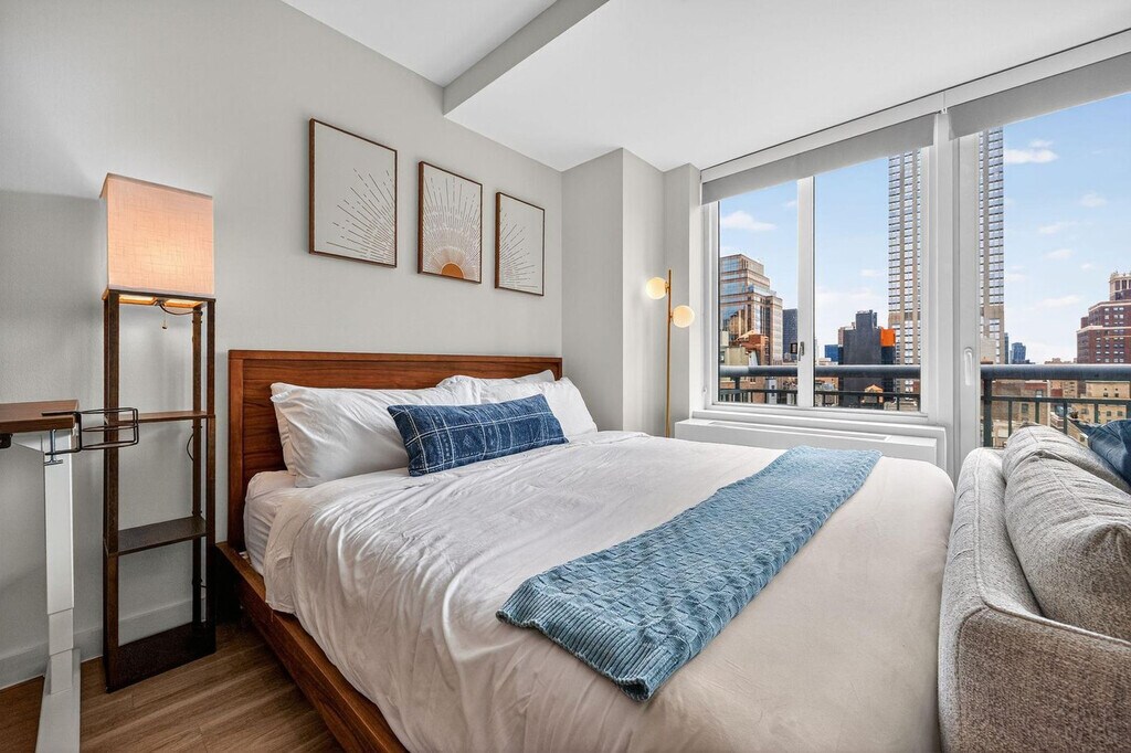 Experience modern luxury and convenience at the vibrant center of Midtown, Manhattan. With the city’s most famous sites just steps from your door and every necessity at your fingertips, enjoy a comfortable, upscale lifestyle in one of the most exciting cities in the world. Take a stroll through nature in beautiful Bryant Park, head over for a burger with friends at Shake Shack, or spend an afternoon shopping at Macy’s. Only a few blocks from the Empire State Building, Whole Foods, Penn Station, and 7 subway lines, you’ll have incomparable access to anything you want in Manhattan and beyond. From the classic, high-end finishes to the exclusive amenities including a landscaped rooftop terrace, co-working space, and 24-hour fitness studio equipped with Peleton bikes, this apartment at Hollingsworth offers a one-of-a-kind combination of practicality and indulgence. The fully furnished studio apartment is custom designed for the remote worker looking for an inspiring environment in which to be productive. This unit includes a fully equipped kitchen with a breakfast bar, full bathroom, private balcony, king-size mattress, smart TV, and all utilities. Most importantly, it features a full home office set-up with private high-speed internet that you won't find anywhere else. Internet speeds are not guaranteed and may fluctuate based on your computer model and the router location. Early check-in from 9am-3pm will incur a fee of $75. Early check-in before 9am will incur a fee of 1 full night's rent based on selected dates. Late check-in after 8pm will incur a fee of $75. Late check-out from 11am-3pm will incur a fee of $75. Late check-out after 3pm will incur a fee of 1 full night's rent based on selected dates. Includes private high-speed internet, standing desk (Uplift), ergonomic work chair (Uplift), 34-inch ultra-wide monitor (Samsung), microphone (Blue Yeti), webcam (Logitech), computer speakers (Bose), LED streaming light, green screen, keyboard (Logitech), mouse (Logitech), laptop stand, and TOTU 16-in-1 Triple Display USB-C 3.1 Docking Station. A laptop computer is not included. [SI]