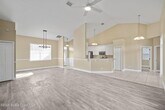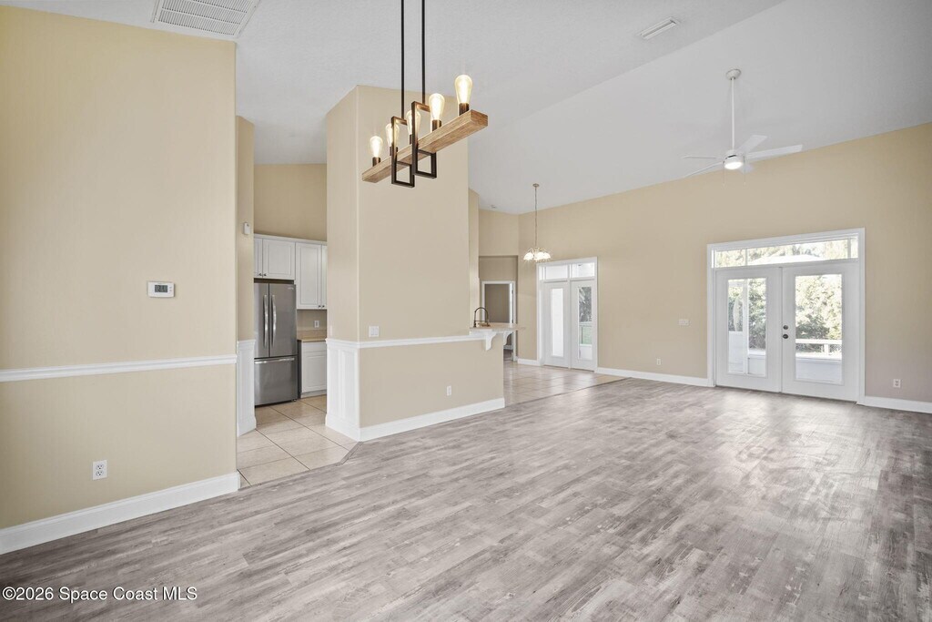 Welcome to secluded living in North Merritt Island on an acre lot,with 3 full bedrooms,formal office,2 bathrooms,and 3-car garage. Newer vinyl plank flooring in the living room with vaulted ceilings,vinyl plank flooring in the bedrooms,and functional kitchen with bar height island overlooking the living room. Spacious back porch overlooking a pond on a beautiful acre lot,with the owner providing lawn maintenance. Ready for move-in now! MLS # 1066858