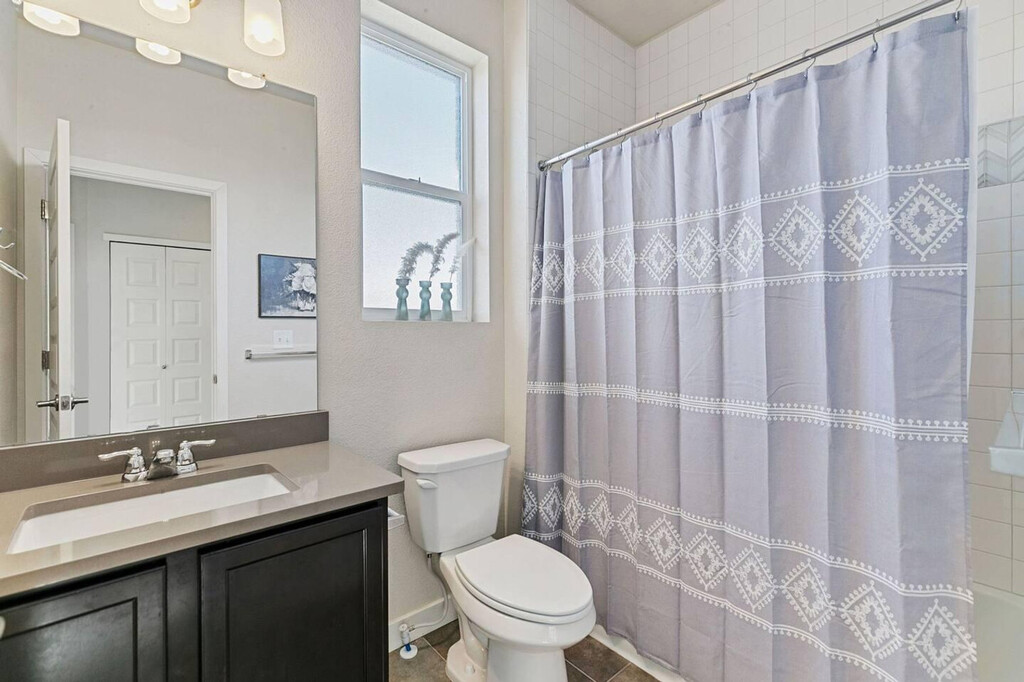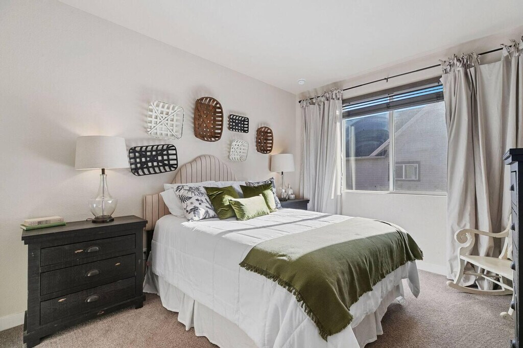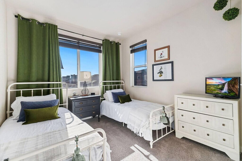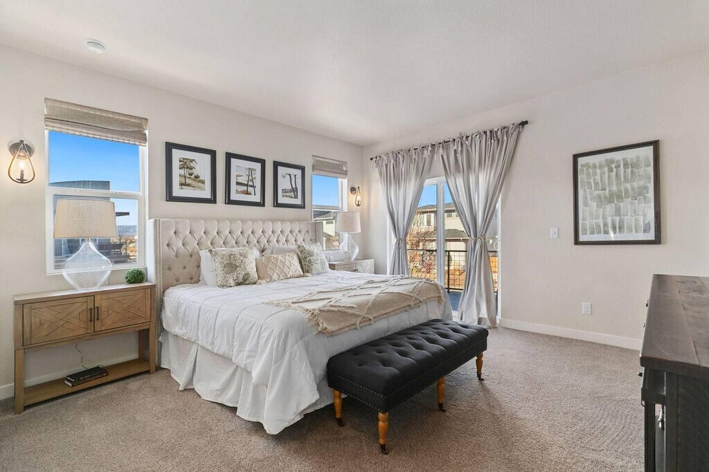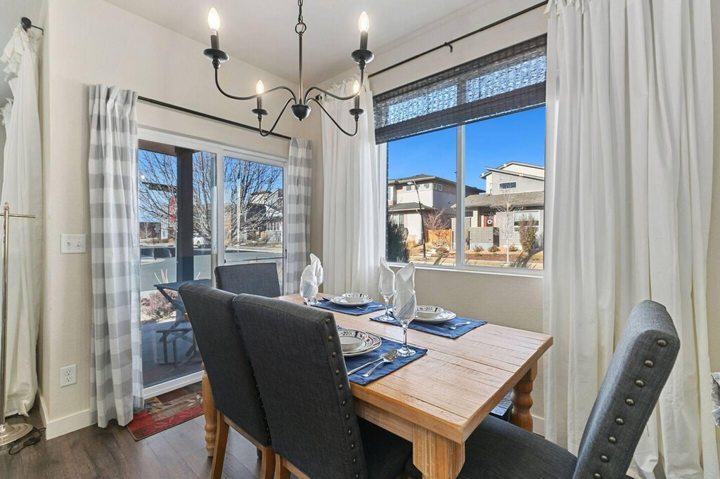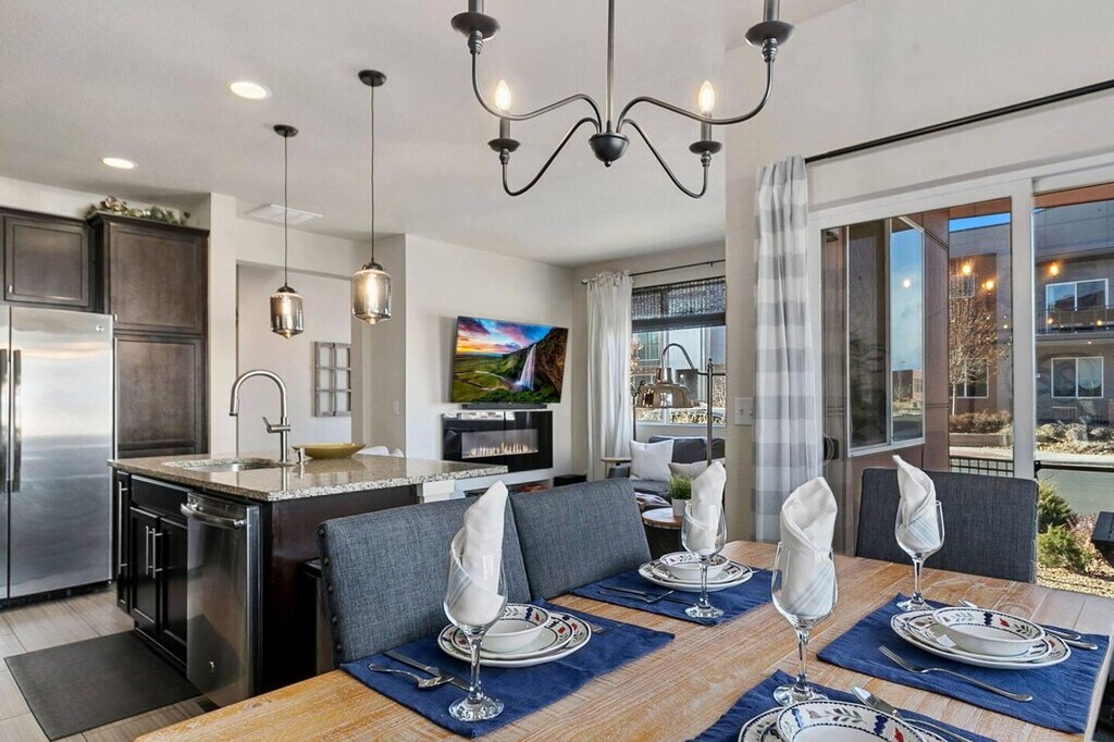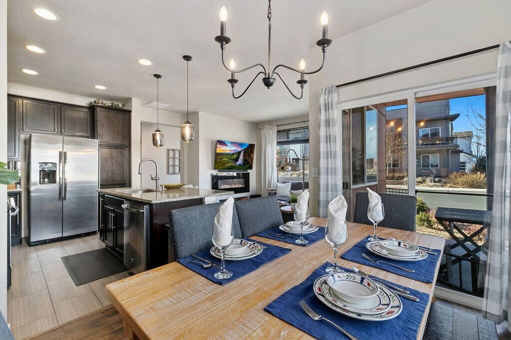 This completely upgraded 3-bedroom, 3-bathroom end unit features an open floor plan with an abundance of natural light and 9' ceilings throughout, making it easy to feel at home. The gourmet kitchen is a highlight, boasting a spacious center island with dining area, granite counters, stainless appliances, gas stove, 42" cabinets, custom backsplash, and under-mount lighting. The apartment includes a patio/deck conveniently located just steps from the kitchen. The upper level houses a master suite with a walk-in closet, private balcony, and a 5-piece bath. Two additional bedrooms, another bathroom, and a flex space complete this level. An oversized two-car garage and a large laundry room add to the apartment's convenience. To make your arrival easier, a starter welcome packet is provided, including toiletries and cleaning supplies. Please note that any supplies beyond this are up to the guest to replenish as they are not restocked. Located in Midtown, just five miles from downtown Denver, the neighborhood offers community gardens, a dog park, and restaurants. It is well-connected by a regional trail system, with the Light Rail station (Pecos Junction Station) just 1.5 miles away, and easy access to highways. Move-in ready. Please be aware that cleaning supplies are not stocked due to safety issues. The apartment provides ample space and natural lighting, ideal for setting up a home office environment. However, specific office furniture and equipment details are not provided. [SI]