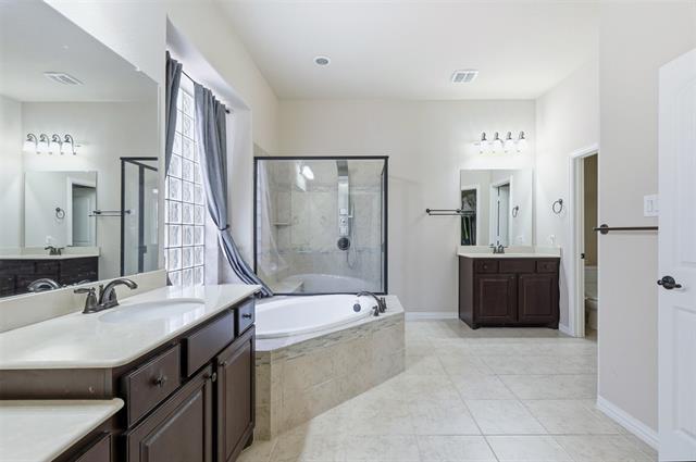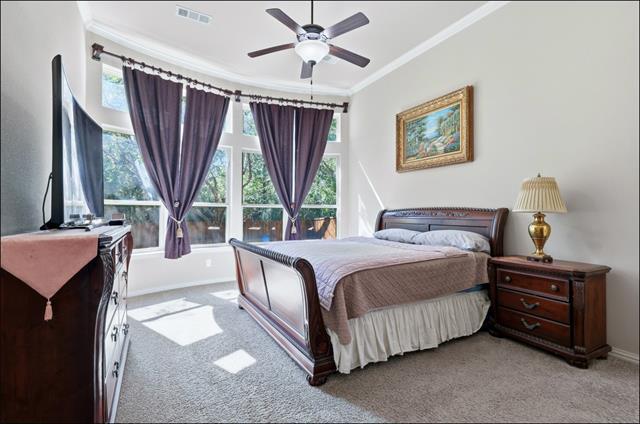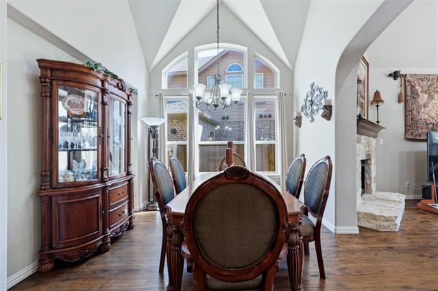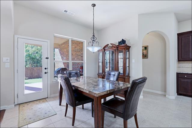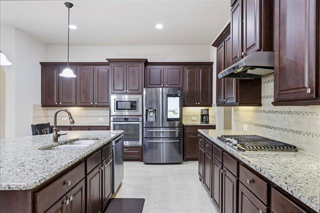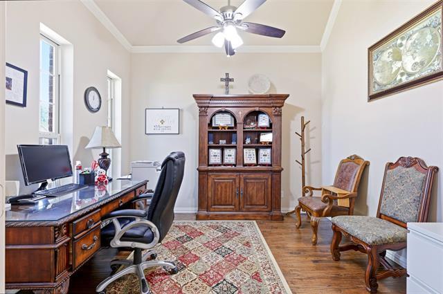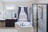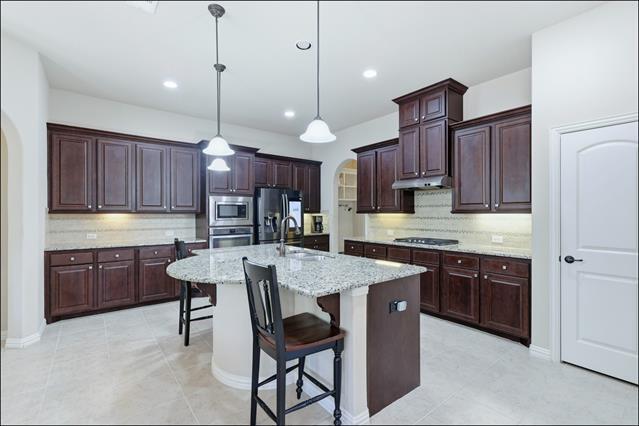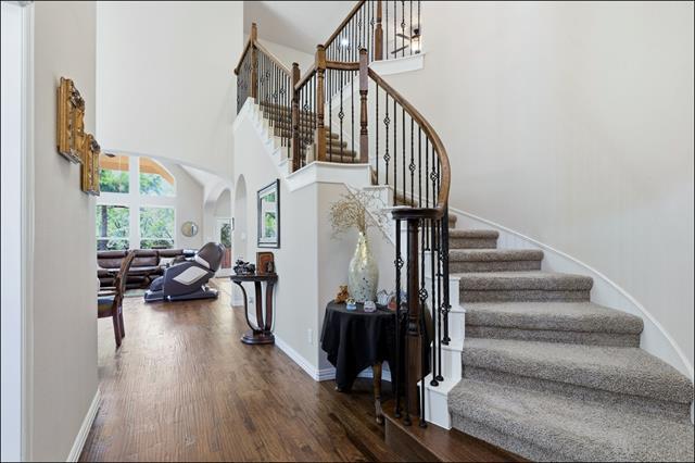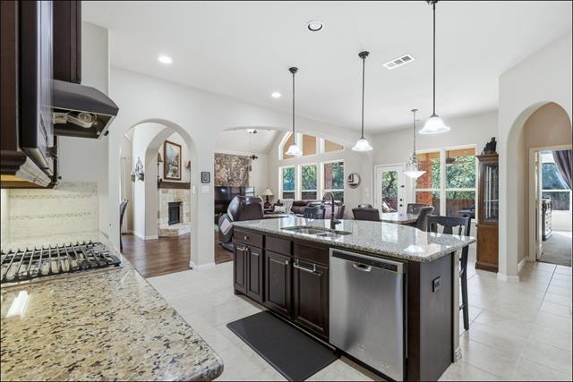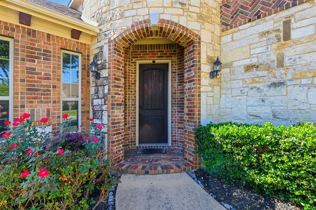 This stunning two-story home will truly impress you! Backing to a peaceful greenbelt, it offers a rare sense of privacy and scenic nature views. The exterior features a beautiful brick-and-stone elevation with a turret-style entry, giving the home exceptional curb appeal. Inside, you’ll find an open and bright layout with vaulted ceilings, arched entries, and warm hardwood floors. The gourmet kitchen is equipped with granite countertops, stainless steel appliances, a gas cooktop, a large island, and a walk-in pantry—perfect for cooking and entertaining. The primary suite on the main floor features bay-style windows overlooking the trees and a luxurious bath with dual vanities, a soaking tub, separate shower, and a spacious walk-in closet. A guest bedroom with a full bath is also conveniently located downstairs. Upstairs includes additional bedrooms, an office, and a large game room pre-plumbed for a wet bar. The 3-car tandem garage offers plenty of space, and the covered patio provides the perfect setting to relax or entertain while enjoying greenbelt views. All furniture and appliances will remain with the home, as the seller is relocating overseas. Located in a friendly community featuring a pool, basketball court, bike trails, and an onsite school, this home combines comfort, functionality, and great amenities.