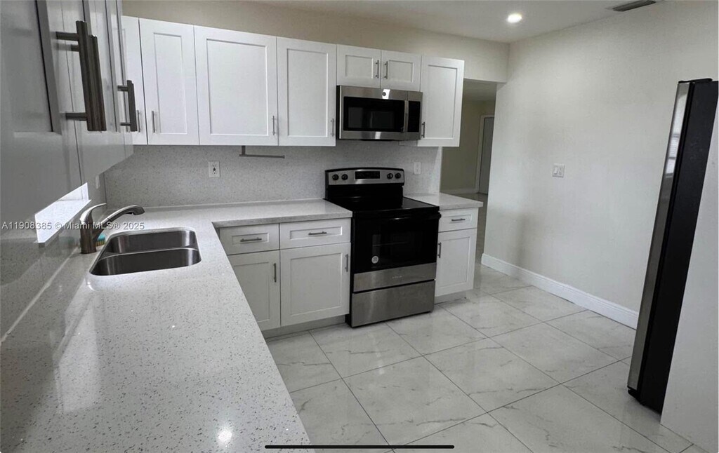 Beautifully remodeled 4BR/2BA home featuring sleek porcelain floors, recessed lighting, and a bright open layout. The new kitchen boasts quartz countertops, stainless steel appliances, and plenty of storage. Spacious bedrooms with modern finishes and updated bathrooms. Laundry/utility room adds convenience with washer and dryer. Large driveway offers ample parking with room for a boat. Enjoy a private fenced yard, ideal for relaxing or entertaining. Conveniently located near shops, dining, and major highways.