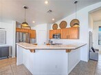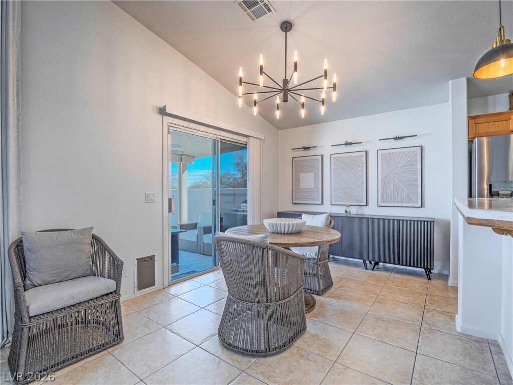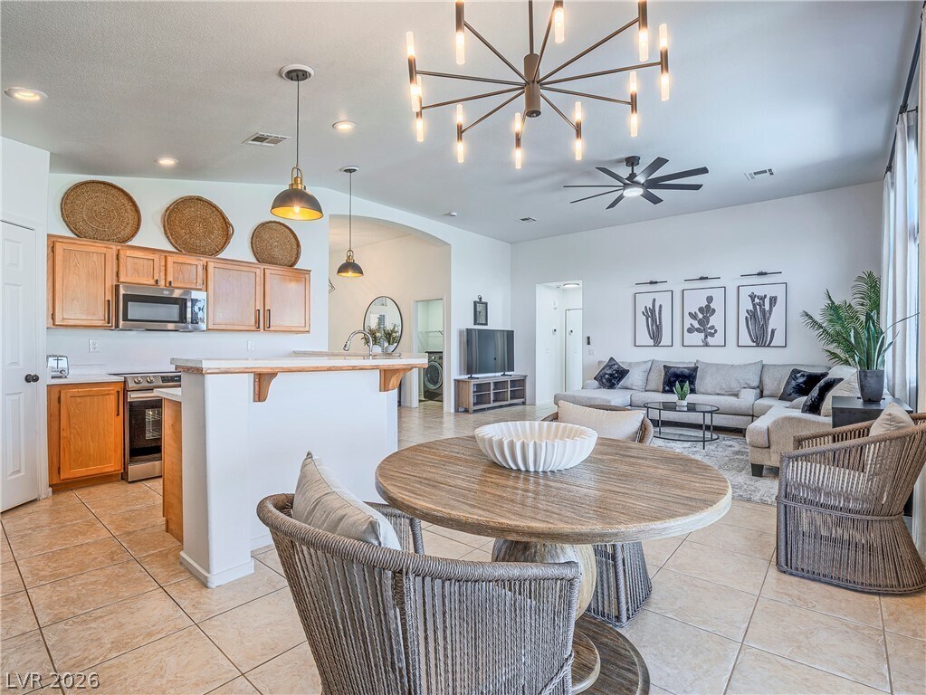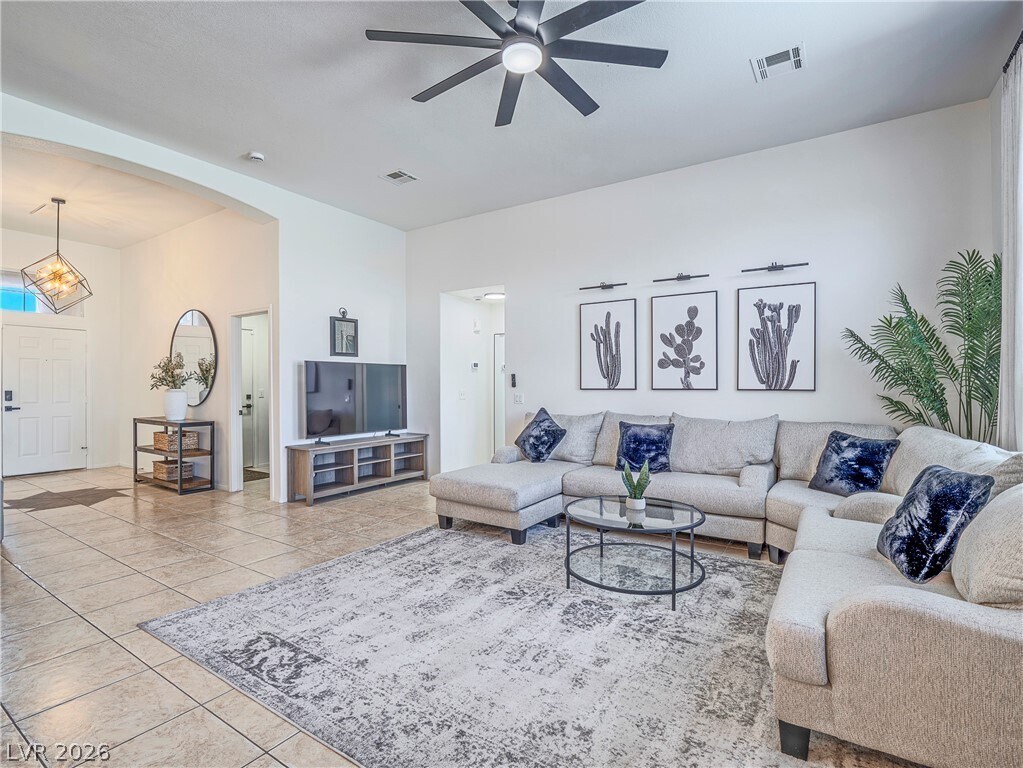Beautiful single-story open-concept partially furnished home with a sparkling pool and no rear neighbors! This 3BD/2BA home features a 2-car garage, vaulted ceilings, and a bright, sunny kitchen with ample space for living and dining. Enjoy large-format tile throughout (no carpet), upgraded lighting, and ceiling fans in every room. *The current price comes as pictured. Sewer, trash and solar power is included with the rent. Split floor plan with the primary suite separate from guest rooms, offering a walk-in closet, additional cabinetry, and extended counter space. Both bathrooms include grab bars for added convenience. Relax under the covered patio with fan and enjoy the low-maintenance, nearly xeriscape backyard. Garage includes built-in cabinets and a water filtration system. A must-see!