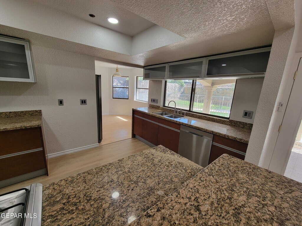 Beautiful One-Level Home with Pool & Modern Upgrades! This spacious 3-bedroom,2-bathroom home offers comfortable single-level living with refrigerated air. All bedrooms are generously sized,and the two main living areas connected. Interior Features: Light wood laminate flooring throughout,including bedrooms. Custom kitchen with granite countertops,modern cabinetry,and stainless steel appliances. Dining area adjacent to the kitchen,opening to the main living space. Additional breakfast nook and flexible maid's quarters—ideal for a home office or guest space. The primary suite includes a tub/shower combo with skylight,walk-in closet,and private commode. Tall privacy walls surrounding the backyard with a shaded patio for outdoor entertaining and a large swimming pool to enjoy during the summer!