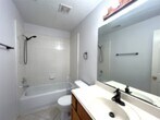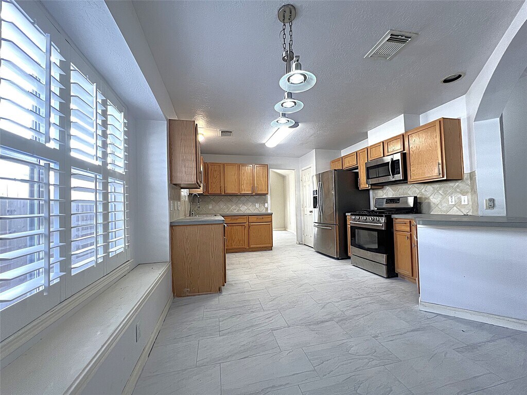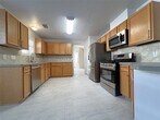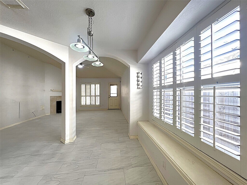 The home features a charming half-hexagonal bay window that brings architectural character and natural light. Marble-look porcelain tile with subtle gray veining runs from the entry to the back door,creating an elegant,cohesive flow. The primary suite includes a spacious walk-in closet,a sleek glass-door shower,and a separate jetted bathtub for relaxing after a long day. The primary bedroom has durable laminate flooring,while the two additional bedrooms are carpeted. All windows are fitted with classic French shutters for style and privacy. The kitchen offers stainless-steel appliances—including a refrigerator,gas range,and dishwasher—plus abundant cabinetry and a brand-new washer and dryer. The fenced backyard features a welcoming patio ideal for outdoor lounging or gatherings. The location is highly convenient,with numerous stores and daily essentials nearby,and a community park just a short walk away. Don’t miss the chance to make this beautifully appointed home yours. MLS# 62234732