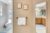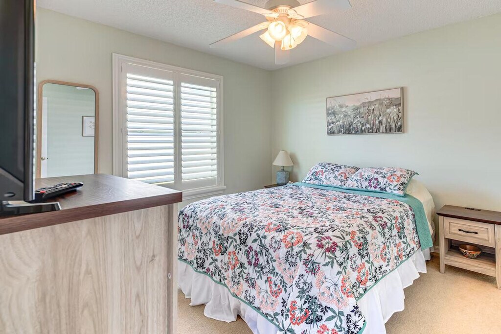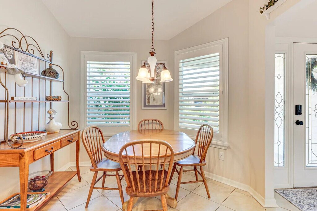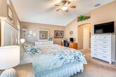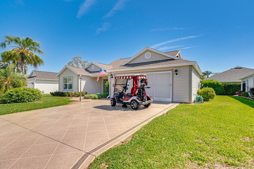 Feel at home in this 3-bedroom, 2-bath vacation rental in The Villages, located 0.5 miles from Arnold Palmer Golf & Country Club. This single-story home requires one step to enter. This 1,900 sq ft home features smart TVs, a dedicated workspace, and a screened patio with seating. The kitchen is equipped with a refrigerator, stove/oven, dishwasher, microwave, dual drip/pod coffee maker, toaster, Crockpot, cooking basics, dishware and flatware. A starter kit of paper products is provided. Enjoy the convenience of free Wi-Fi, central A/C and heating, and provided linens and towels. A 2-seater golf cart is available for use, subject to a waiver. The Villages community amenities, including outdoor pools, tennis, bocce and pickleball courts, shuffleboard, cornhole, golf courses, fitness centers, recreation centers, and live music at 4 village squares, are available for an additional fee of $50 per couple, payable on-site upon arrival. Enjoy coffee on the patio, golf in the morning, and sunset views at Lake Sumter Landing. You can hit the greens, explore the lively town squares, or unwind in the cozy living space. Numerous restaurants are available, or you can enjoy a home-cooked meal. Smoking, pets, events, parties, and large gatherings are not allowed. Guests must be at least 30 years old to book, and a photo ID will be required upon check-in. An external security camera is located on the front of the home facing the front entry. The camera is outward facing and does not look into interior spaces, but it records video and sound when activated by motion. [SI]