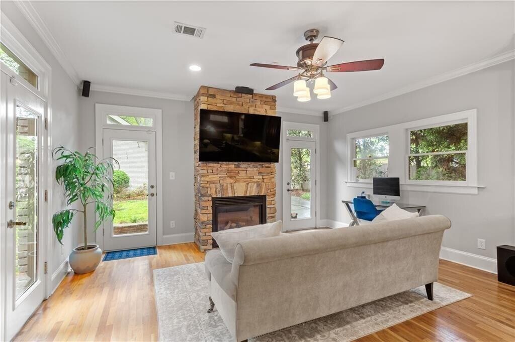 Light-filled,beautiful true 2 story,five-bedroom home with rare 2-car garage in amazing Morningside location--one of Atlanta's most sought-after neighborhoods! Updated home with a large chef's kitchen that opens to a gorgeous keeping room with fireplace. The living room has custom built-in shelving that frames a 2nd fireplace; there's a separate dining room,and bonus/flex rooms,including a main level sunroom and a finished basement with a fireplace,both perfect for exercise room/den/office. Hardwoods throughout. The five bedrooms are on the 2nd level,two have ensuite baths. There are three sets of French doors that lead to the level walk-out backyard,with large flagstone patio,tranquil water feature and the detached 2 car garage. Driveway leads to porte cochere with gated entry to backyard/garage area. Morningside Elementary School. Walk to restaurants,shopping,the BeltLine,Piedmont Park. Landscaping is included. Sorry,no short-term rentals. Dogs up to 55 pounds considered on a case-by-case basis. Landlord prefers minimum 2-year lease,good credit score,at least 3xrent income monthly,no roommates--thanks!