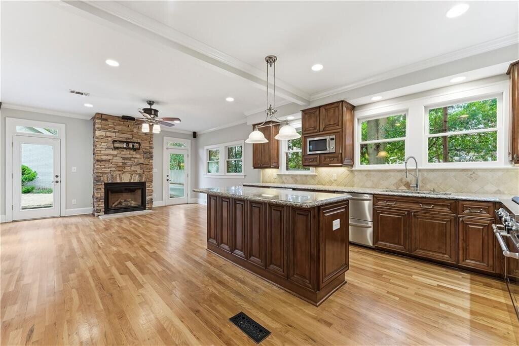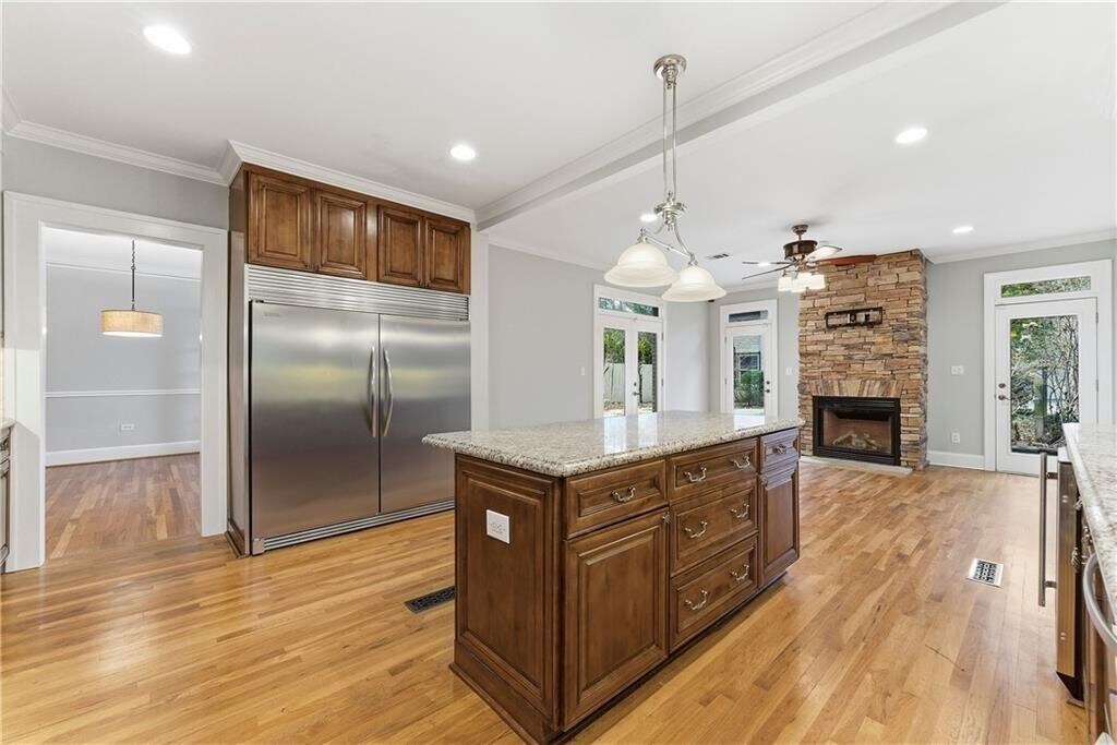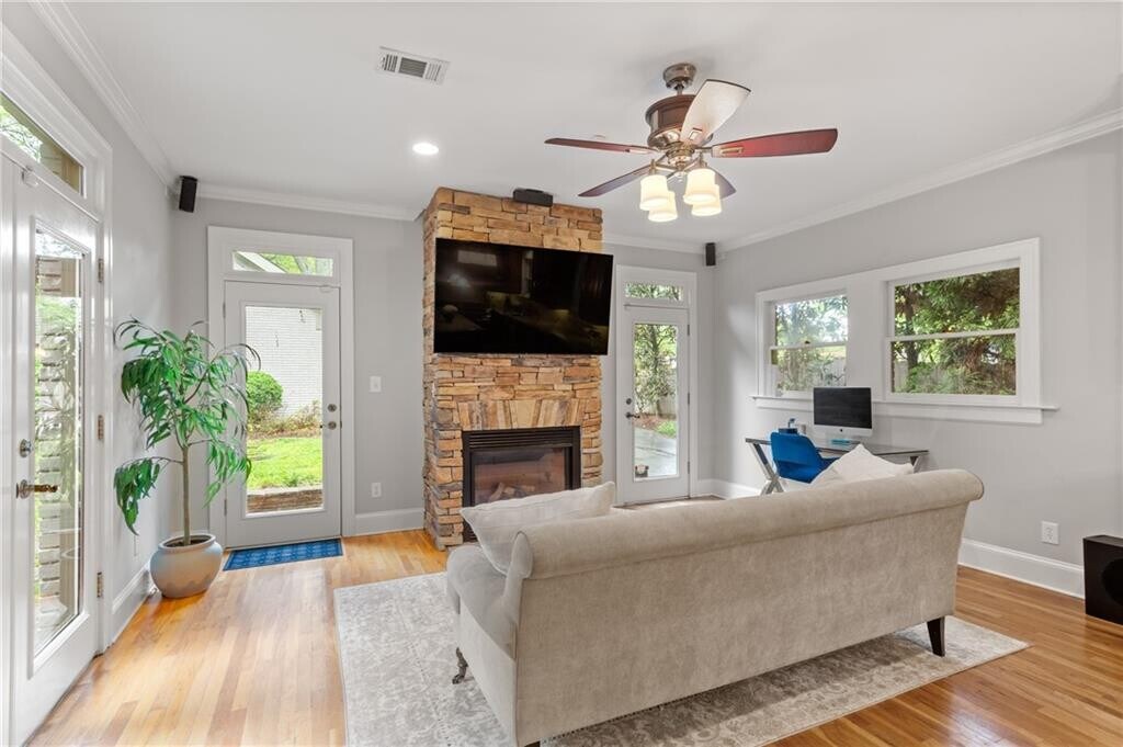 Ideally located at 685 E Morningside Drive NE,this light-filled and beautifully updated true two-story,five-bedroom single-family rental offers a rare opportunity to enjoy timeless 1928 old-world charm paired seamlessly with modern comfort in the heart of Morningside—one of Atlanta’s most sought-after neighborhoods. The home features a detached two-car garage with gated entry,additional driveway parking,and a charming porte cochere,enhancing both functionality and character. The spacious chef’s kitchen opens to an inviting keeping room with a fireplace,while the main living room showcases custom built-in shelving framing a second fireplace,ideal for everyday living and entertaining. Additional flexible spaces include a sunroom on the main level and a finished basement with a fireplace,perfectly suited for a home office,fitness room,or den. Hardwood floors run throughout the residence,with all five bedrooms located on the upper level,including two with ensuite baths. Multiple French doors lead to a level backyard with a flagstone patio and a tranquil outdoor setting. Zoned for highly regarded Morningside Elementary and just minutes from Piedmont Park,the BeltLine,dining,shopping,and major intown amenities,this home is ideal for tenants seeking a refined rental that blends historic character,space,walkability,and an exceptional intown location. MLS ID 7705769