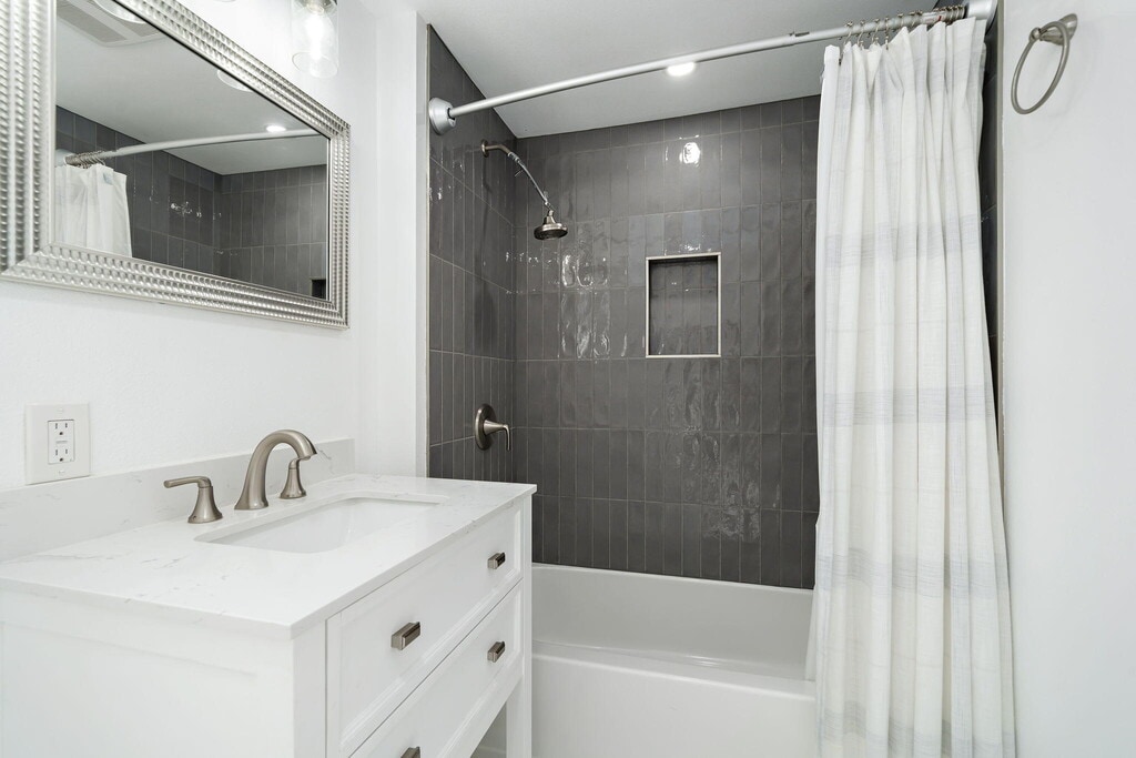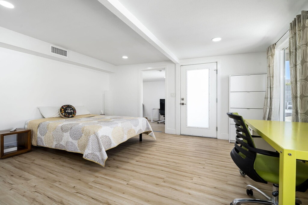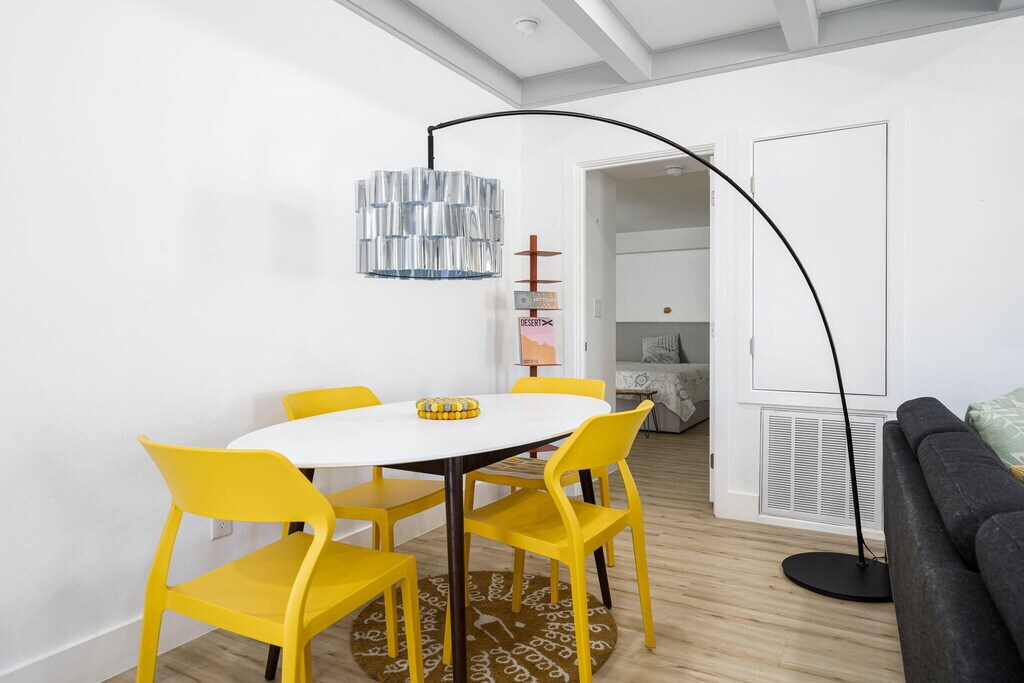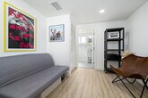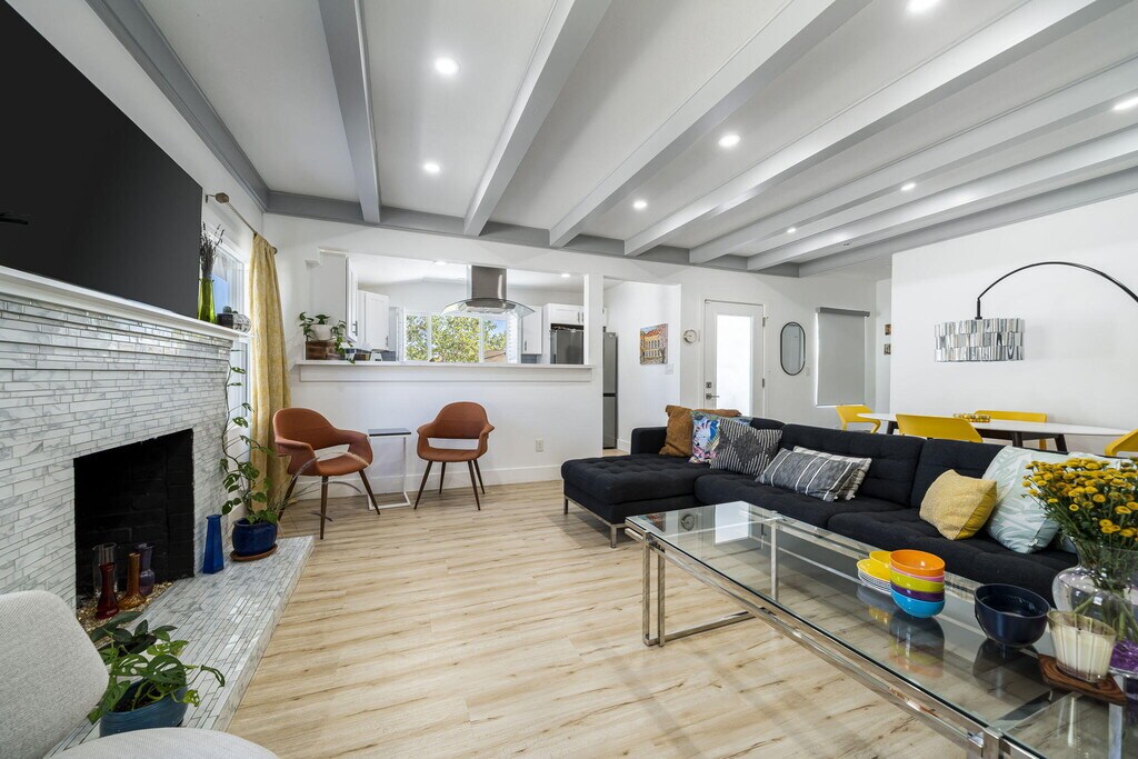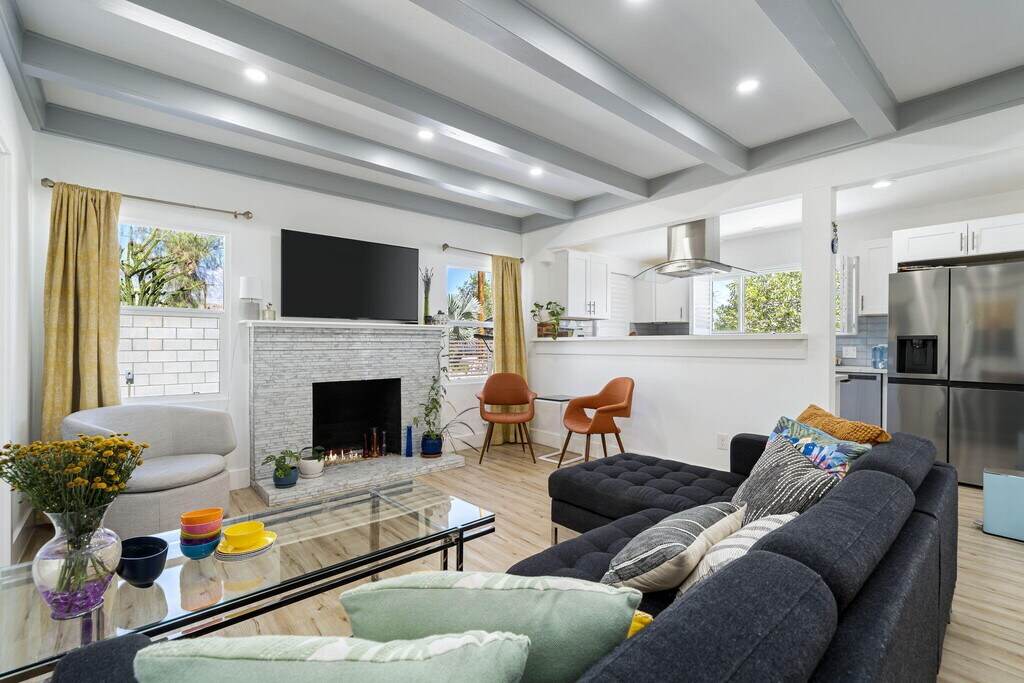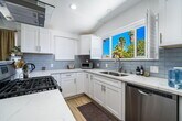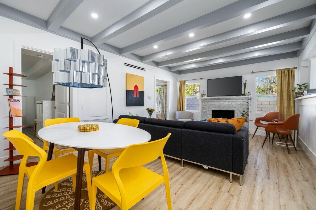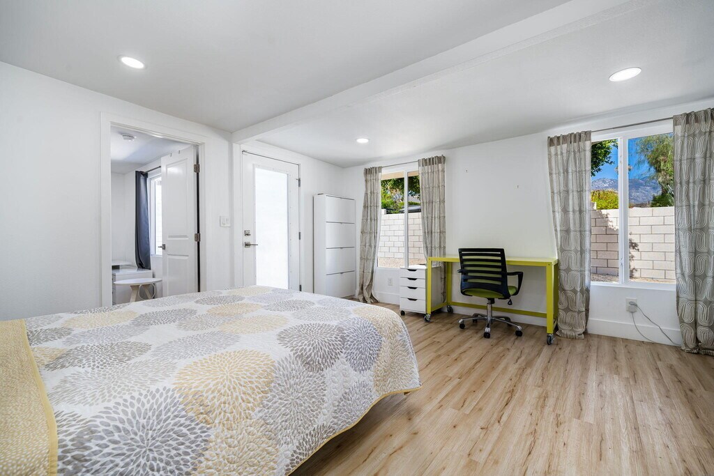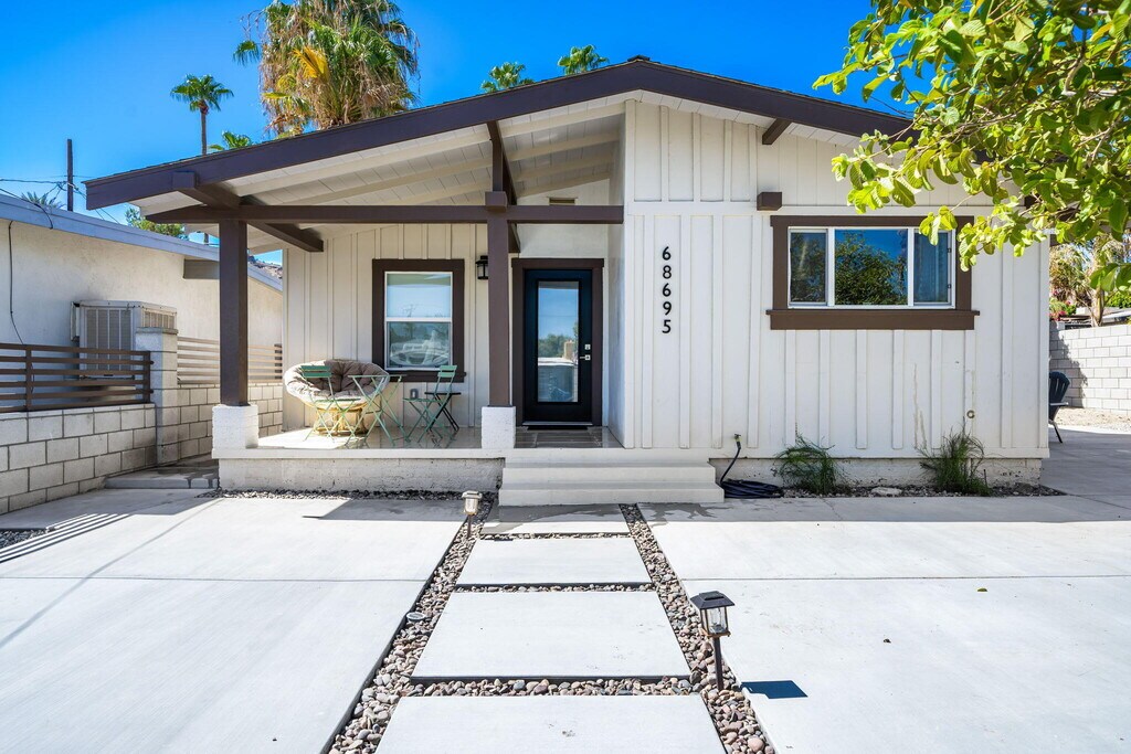 Impressive,Remodeled Craftsman in the Coveted Cathedral City Cove! SEASONAL RENTAL AVAILABLE ALL MONTHS. Bright and beautifully updated,this 2+ bedroom,2.5 bath single-family home blends timeless charm with modern amenities. Enjoy sweeping mountain views,Luxury Vinyl Plank flooring,and newer dual-pane windows and doorsall just 4 years old. The open-concept kitchen shines with soft-close white cabinetry,white quartz countertops,stainless steel appliances,and a gas cooktop. Three fully remodeled bathrooms include two elegant full baths and a chic powder room off the living area. Recessed LED lighting,a sleek all-glass gas fireplace,and a versatile bonus roomideal for a home office or creative spaceadd style and flexibility. Interior laundry with upgraded closet for stackable washer/dryer,high-efficiency HVAC system,and low-maintenance landscaping make daily living easy. Fully gated for privacy,the property features dual driveways (front and rear) with parking for up to 5 vehiclesor bring your RV! Located on a great street in sought-after The Cove,this home is move-in ready and truly stands out.