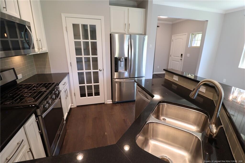 Opportunity awaits in this luxury end unit townhome available for immediate residency. 689 Wickham Road is nestled in the Pemberley Community in Apex and minutes away from downtown Apex, NC-55/I-40, Kelly Road Park, restaurants, schools, and much more! Upon entering via your covered porch, you're greeted by an attractive open-concept interior that's accentuated by lovely hardwood floors, loads of natural light and 9' ceilings throughout. The foyer leads to the exceptional kitchen and an adjacent dining area that flows seamlessly into the family room. The stunning kitchen features white shaker cabinetry accentuated by accent lighting, expansive granite countertops illuminated by under-cabinet lighting, a subway-tile backsplash, and a spacious pantry with a glass door. The kitchen is also equipped with an undermount double bowl stainless sink and a double-tiered breakfast bar, complete with custom pendant lighting. You'll love the stainless steel appliance package which includes a built-in microwave, a gas oven, dishwasher, and a French door refrigerator with water/ice dispenser in door. Adjacent to the kitchen is the dining space which includes two picture windows and a custom chandelier. Across from the kitchen and dining area you'll find the spacious family room designed with easy furniture placement in mind. This space showcases a ceiling fan, three picture windows, a cozy gas log fireplace with a mantle and custom stone treatment as well as direct access to the back patio where you'll enjoy the fenced-in backyard and the peaceful pond view. Before heading upstairs, be sure you visit the 1st floor bedroom with a large closet and an adjacent full bathroom around the corner This bathroom features tiled floors, a marble vanity and a walk-in, tiled shower with 2 shampoo niches. Don't need a 4th bedroom? This is the perfect area to be utilized as a home office, study, etc. Next, take a quick jaunt upstairs where you're greeted by a spacious loft showcasing 4 picture windows, a collapsible, built-in floating shelf, and a TV mount already in place. The loft provides that extra room that we all seem to be in need of and could also be put to work as a home office or even a media room. This loft also serves to split the primary suite from the other bedrooms; adding valuable privacy. Accessible via the loft is a conveniently-located 2nd floor laundry room with a washer and dryer included for resident's use. The primary bedroom is quite spacious with three double picture windows, a ceiling fan, a truly enormous walk-in closet, and an en-suite bathroom with a sliding barn door. The en-suite bathroom includes tiled floors, a garden tub with a tiled surround, dual sinks atop a marble, elevated vanity and a separate walk-in, tiled shower. Bedroom #3 and #4 are generously proportioned with ample closet space, lovely natural light and easy access to the full hall bathroom with an extended vanity and a walk-in tiled shower.