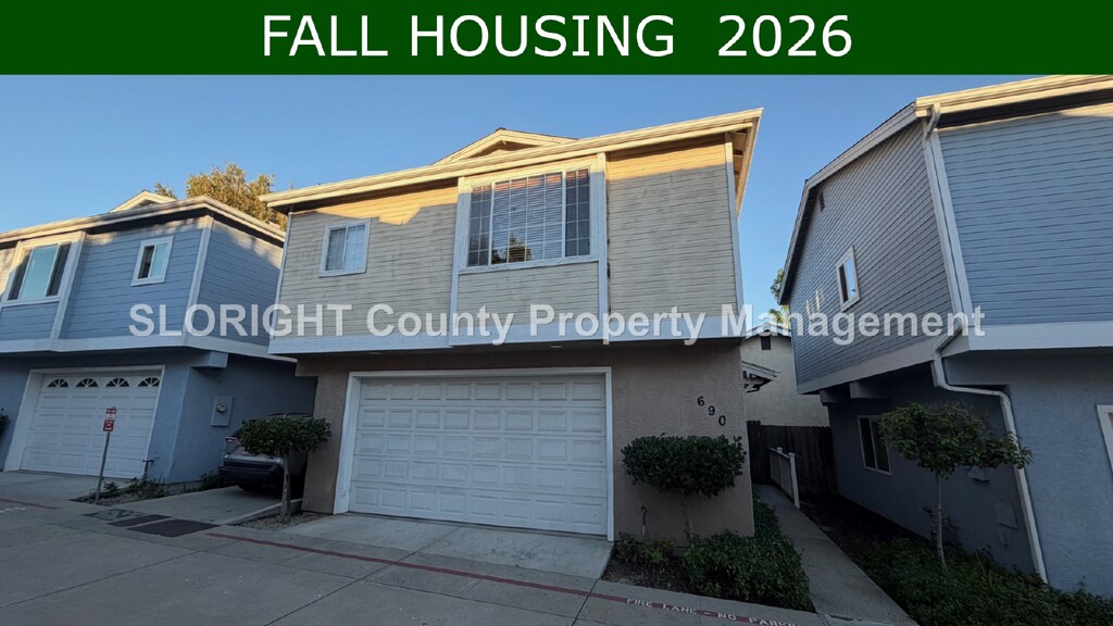 FALL HOUSING 2026 SEE FALL HOUSING FLYER (read before applying): This two-story townhome in San Luis Obispo has a two-car garage, one bedroom downstairs, and two bedrooms upstairs. The living space features new flooring and an open plan. Off-street parking is first come first serve. It is conveniently located near a bus station, shopping, grocery, and restaurants making it ideal for not having a car as well. Appliances include a fridge, stove/oven, microwave. 12 Month Lease. This is a NO PETS property. No smoking is allowed inside the home. The tenant is responsible for all utilities associated with the property. If selected as a tenant, a Move-in Fee of $49 per household is required. The fee covers a move-in inspection including digital records of property conditions for tenant protection. DO NOT DISTURB CURRENT TENANTS. A showing associate from our company must be present to show you around the home. We will not be doing open house showings for Fall Housing properties with tenants inside. If your group is chosen for a property, we will schedule a time where everyone in your group will have to view the property in person before a lease is written. Please carefully read the Fall Housing Flyer BEFORE applying to ensure you submit everything correctly. The flyer is located at the top of the property description and the Rental Search page. Foothill Blvd., San Luis Obispo CA BRE Broker's Lic # 01876023