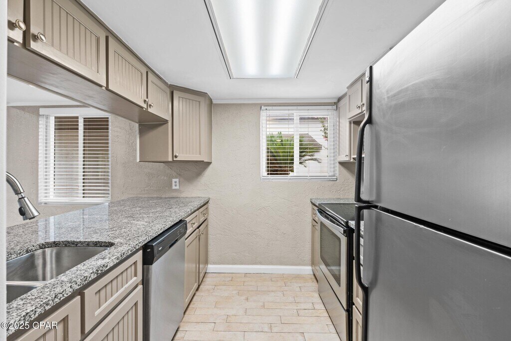 Welcome to Palisades, a serene lagoon-side community offering stunning views and unbeatable access to all the best of Panama City Beach.Enjoy the convenience of covered parking and a spacious, tiled back porch that opens to a lush, grassy common area--perfect for relaxing or playing. The community amenities are just steps away, including a sparkling pool and clubhouse.Inside, you'll find a freshly updated beach cottage aesthetic with coastal charm throughout. The ground floor features durable wood-look plank tile, new granite countertops, upgraded cabinetry, and stainless-steel appliances. A stackable washer and dryer, ample storage space, and a stylishly remodeled half bath add to the home's appeal.This delightful end unit offers the ideal coastal lifestyle. **Included in rent are garbage, lawncare, water/sewer, pest control, and pool care.**