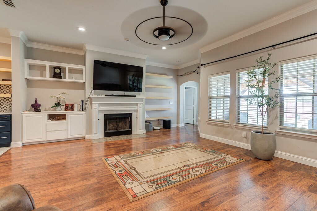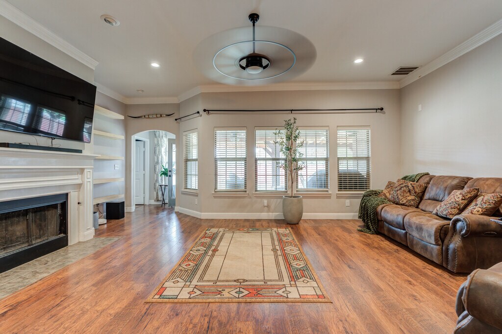 Spacious and inviting 4-bedroom, 3-bath, 2-car garage home located on a quiet cul-de-sac in Quincy Park. This property offers beautiful curb appeal with well-maintained landscaping, mature trees, blooming roses, a covered front porch, and charming wood-stained cedar shutters that complement the brick and stone exterior. Inside, you'll find an open-concept layout featuring an isolated primary suite and a versatile flex space perfect for a home office, playroom, formal dining or additional lounge space. The kitchen is designed for both function and style, offering stainless steel appliances, granite countertops, perfect coffee station, and a large island ideal for casual dining and entertaining. The spacious primary suite provides a relaxing retreat with a spa-like bathroom and two closets. A separate isolated bedroom and bath offer added privacy, while two additional bedrooms share a conveniently located hall bathroom. Enjoy outdoor living with an extended patio, pergola, 7x7 storage shed, and evergreen trees for added privacy. Located in the highly sought-after Frenship School District and just steps from the neighborhood park, this home truly has it all!