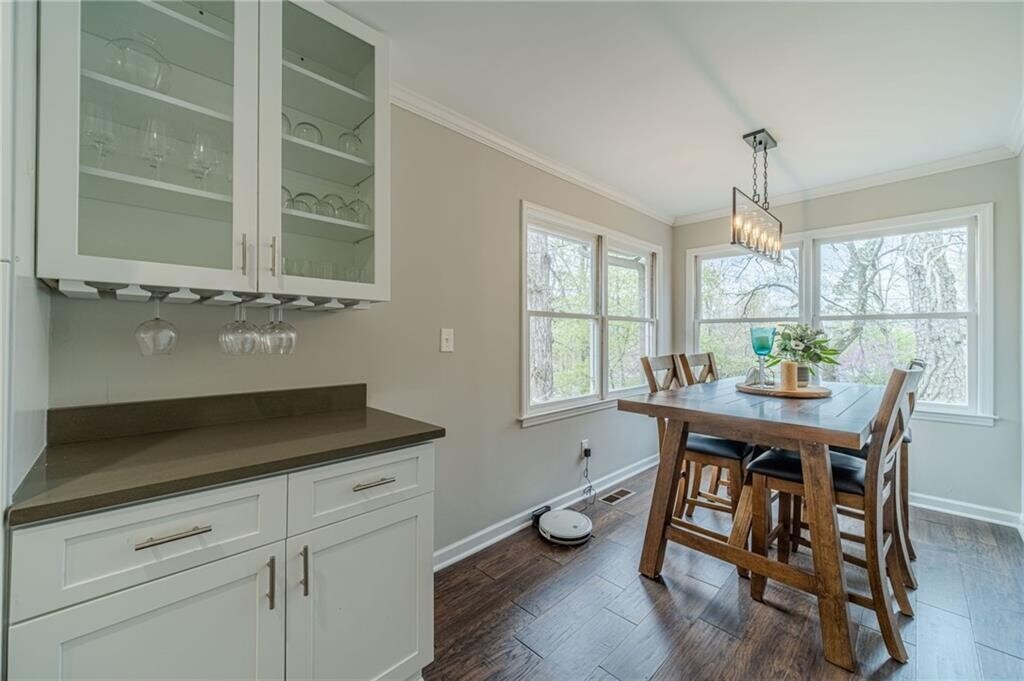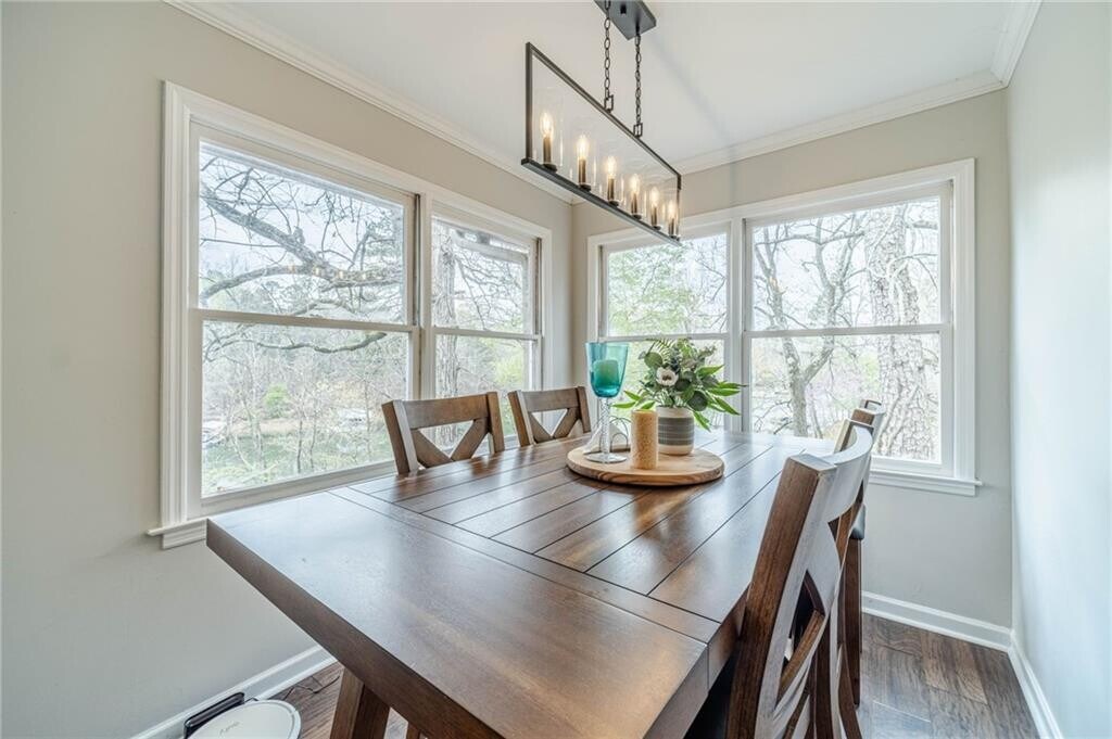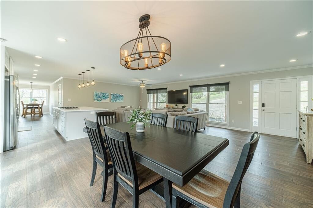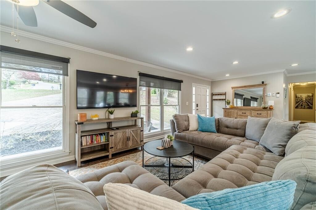 Enjoy lakeside living in this fully furnished Lake Lanier retreat available as a mid-term rental with a 30-day minimum,offering a spacious and thoughtfully designed layout with utilities included for easy,turnkey living. The main level features a bright,open-concept living and dining area with beautiful flooring,abundant natural light,and a stunning kitchen complete with a large island,sleek cabinetry,stainless steel appliances,and stylish pendant lighting,perfect for everyday living and entertaining. The main-level primary suite features a private bath with a tiled shower and dual vanities,while the secondary bath is well-appointed to serve the additional bedrooms. The finished basement adds additional living space with a second family room,game area,wet bar,one bedroom,and a full bath. Step outside to enjoy multiple outdoor living spaces including a covered patio,upper deck,and a gentle path leading to a private dock on calm water,ideal for enjoying all that Lake Lanier has to offer,from boating and kayaking to peaceful mornings by the water and evening sunsets. Known for its expansive shoreline,scenic coves,and year-round recreation,Lake Lanier provides a true getaway feel while still being within convenient reach of nearby shopping,dining,and major roadways,making this home the perfect blend of comfort,convenience,and lakefront lifestyle. MLS ID 7743370