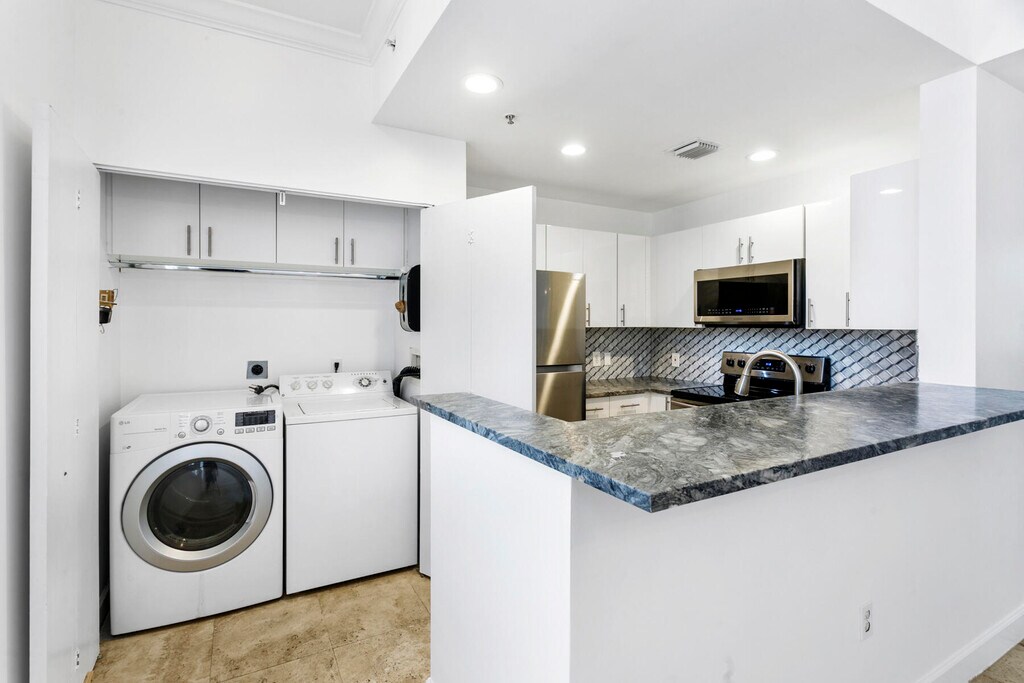 Wonderful CitiPlace location! Walk out your door and be in the middle of all that West Palm Beach has to offer - including great restaurants, many shops, gyms, a Publix, office towers and more! This 3 story townhome is freshly painted and has gleaming marble floors throughout. !st floor has an office/den/bedroom with a powder room and direct access to your own private 2 car, gated garage. 2nd floor - large living room, dining room and an open kitchen with laundry.3rd floor is the primary suite with a large bedroom with built-in shelving, walk-in closet and a full bath, and there is a second en-suite bedroom with a full bath. And the community has a gated, community pool too!
