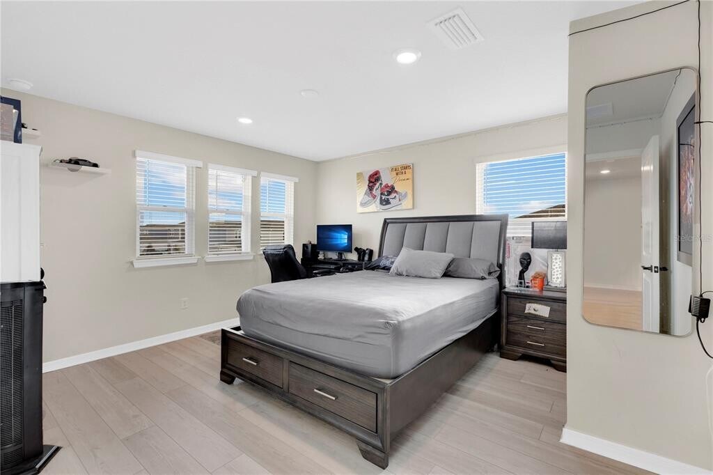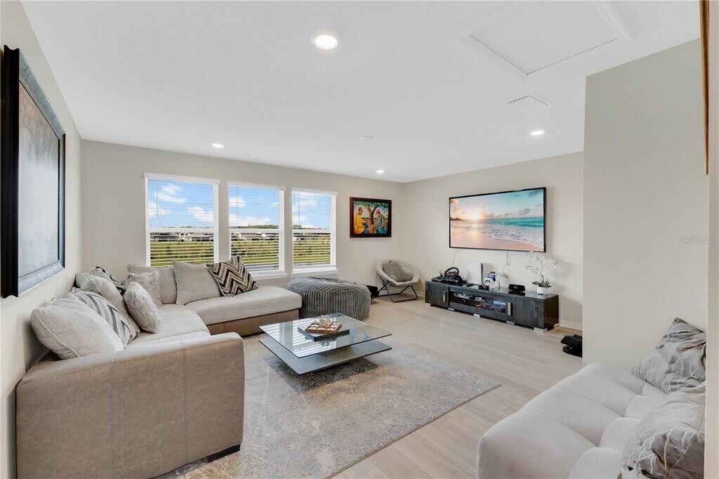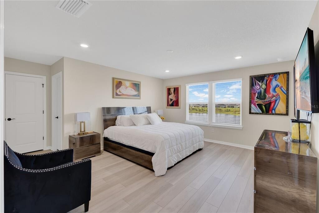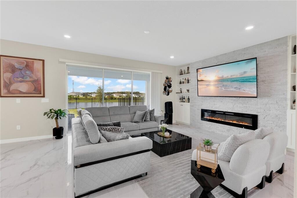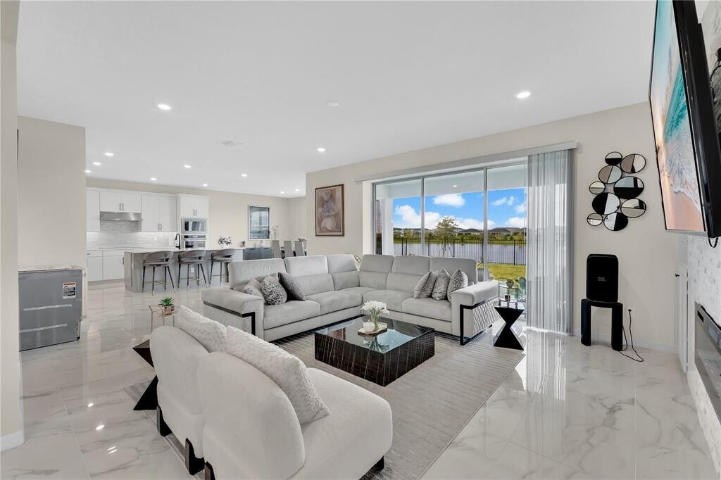 One or more photo(s) has been virtually staged. Contemporary residence located in the master-planned community of EverBe in Orlando. The first floor features open living areas with large-format porcelain tile and a modern kitchen equipped with KitchenAid appliances,a quartz island,and generous storage. The main living space includes a stone accent wall with an electric fireplace,along with two flexible office spaces on this level. On the second floor,all bedrooms include custom built-in closet organizers and new laminate flooring. The primary suite includes a glass-enclosed shower,dual vanities,and a walk-in closet,and an additional loft provides extra living space. The home is located on a lake-view lot with a large backyard,and the garage features an epoxy floor finish with interior parking for two vehicles plus driveway space. Washer and dryer are included. Residents of EverBe have access to resort-style amenities including a beach-entry pool,fitness center,sports courts,walking trails,playgrounds,and a waterfront town center,with convenient proximity to Lake Nona,Orlando International Airport,major highways,shopping,and dining. MLS# S5137951