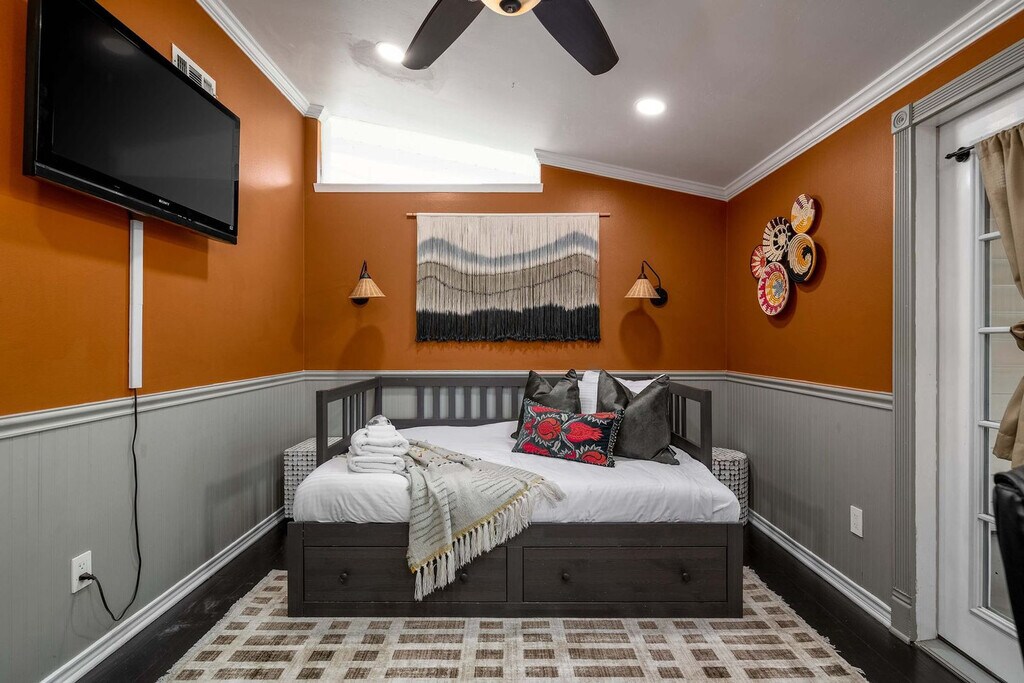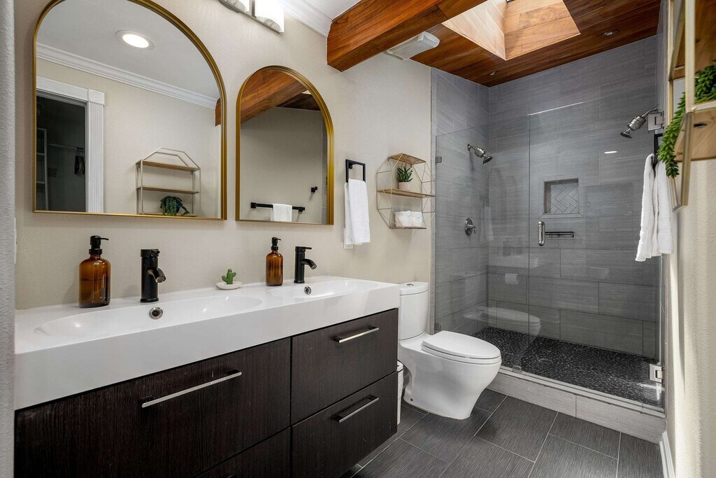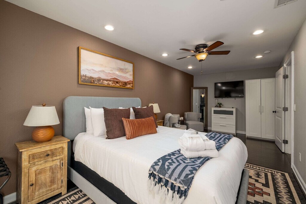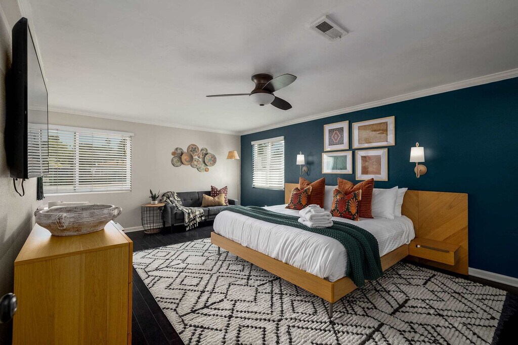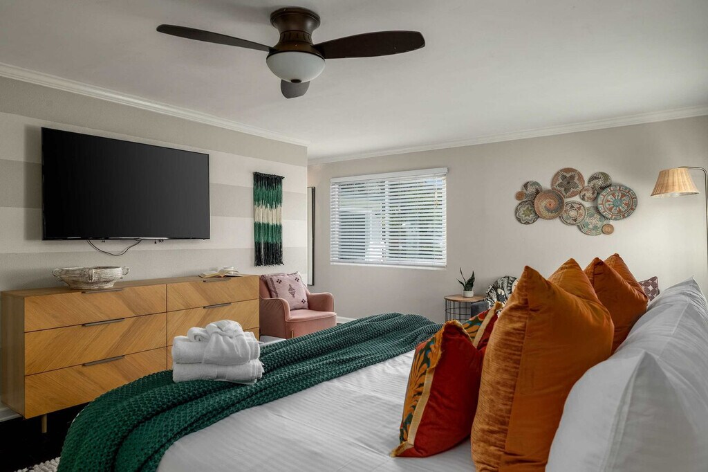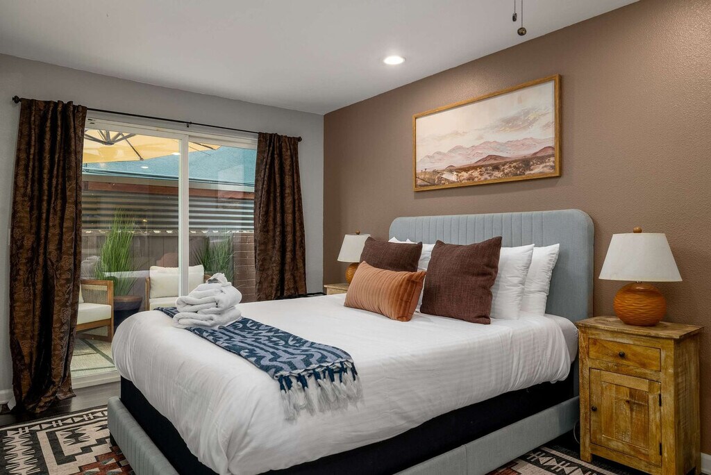 Welcome to this modern and updated 4-bedroom, 2-bathroom family home located in a prime San Diego location. With a modern open layout, this home features a fully equipped and stocked kitchen, a large backyard with a spa and pool table, high-speed internet, dedicated parking, and a home gym in the garage. Enjoy the comfort of central AC throughout the home. This spacious home comfortably sleeps 10 guests. The first bedroom features queen-over-queen bunk beds, a closet, and sliding doors that open to the backyard patio. The second bedroom includes a queen bed, a workspace with a desk and chair, a closet, a smart TV, and sliding doors leading to the patio. The primary suite offers a king bed, a cozy sofa, a smart TV, two large closets, and a beautifully lit ensuite bathroom. The fourth bedroom provides a queen bed, a smart TV, and its own private patio. The living room boasts a cozy open layout with a large custom couch, an oversized smart TV, and plenty of natural light. The dining area seats six comfortably, with additional bar seating in the kitchen. The fully equipped kitchen includes a dishwasher, coffee maker, and all the essentials for preparing meals with ease, making you feel right at home. Pets are allowed only with prior approval. Unapproved pets will result in fines and additional cleaning fees. Located just 5 minutes from Grossmont Center, 10 minutes from La Mesa Village and Farmers Market, and 15 minutes from Mount Helix, this home is perfectly situated for exploring San Diego. Enjoy local breweries and dining options within 10 to 20 minutes. Nearby attractions include Mount Helix, La Mesa Village, Lake Murray, Mission Trails Regional Park, Harry Griffen Regional Park, and the La Mesa Depot Museum. Quiet hours are from 10:00 PM to 8:00 AM. The total number of guests must not exceed what is listed on your reservation, including children and infants. Up to three additional daytime guests are allowed but must leave by 10:00 PM. Any overnight guests not listed on the reservation or anyone staying past 10:00 PM will incur a $100 per person, per night fee. Smoking of any kind is strictly prohibited inside or outside the home, with violations resulting in a minimum $600 odor removal fee. Parties, events, or large gatherings are not permitted. Check-in is at 4:00 PM and check-out is by 10:00 AM. Late check-outs without prior approval will result in additional charges. A $150 cleaning fee may apply if the home is left excessively dirty. Open flames and candles are not allowed inside. Children must be supervised at all times, especially near gym equipment, the spa, and fire pit. Use the home gym at your own risk and wipe down equipment after use. Please lock all doors and windows when leaving the home. If any damage occurs during your stay, notify us immediately. The second bedroom includes a desk and chair for a convenient workspace, complemented by high-speed internet throughout the home. Registration Number: STR-12120L [SI]