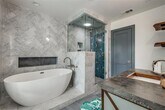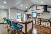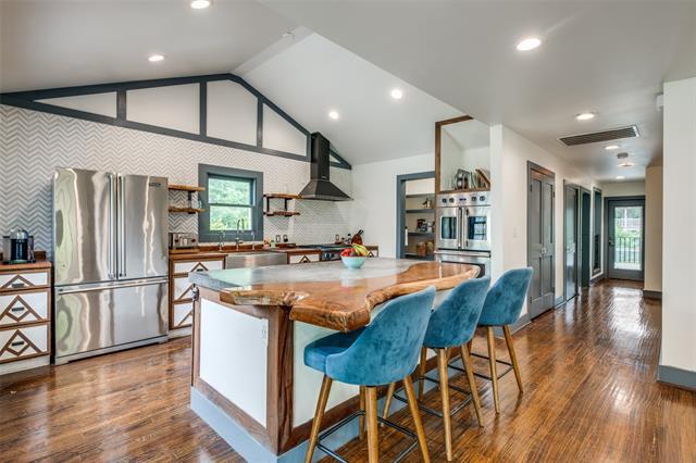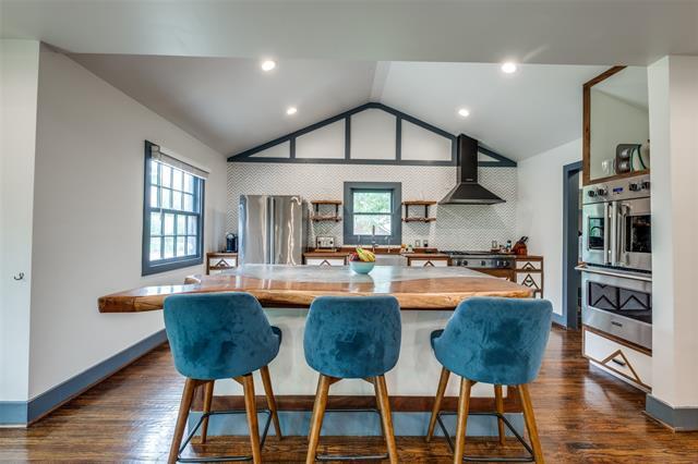 Welcome to this stunningly updated split-level Tudor nestled in the sought-after Santa Monica enclave of Hollywood Heights. A charming short stone wall borders the sidewalk, guiding you to a striking Tudor-style façade with a distinctive three-peak roof and custom masonry that sets the tone for the elegance within. Inside, vaulted ceilings and hand-scraped hardwood floors flow through the open-concept living, dining, and kitchen spaces. A marble and ceramic tile faced fireplace and an abundance of windows creates a bright and cozy atmosphere, perfect for both relaxing and entertaining. The designer kitchen is a chef’s dream, featuring a custom made live-edge wood and concrete island with bar seating, ample storage, and high quality stainless steel Viking appliances—including a double oven, gas cooktop, microwave, and dishwasher. A spacious walk-in pantry adds even more functionality. The entry ground level also includes two secondary bedrooms, A stylish guest bathroom with marble tile and designer cabinetry and counters, 13x14 balcony, and the primary suite. The large 13x14 balcony feels like a whole extra vibe, bringing the outdoors inside. A large primary bedroom with access to large balcony, generous natural light, and a spa-like en suite bathroom featuring a soaking tub, frameless glass marble-tiled shower, designer sink, and a large walk-in closet as well as a secondary dual closet. Downstairs, the second level offers another expansive living room bathed in natural light from multiple windows, two additional bedrooms, A 3rd full designer bathroom with marble tile and glass door to shower. Also there is a second laundry area, and direct access to storage—making it ideal for a multigenerational living setup. Step outside from the lower living room to find a covered porch, sunny wooden deck, and a private backyard with green space to unwind or entertain.