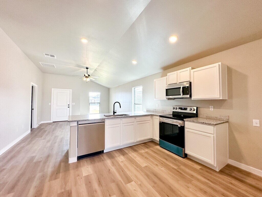 This Bentenbough home is conveniently located in west Lubbock. The home features vinyl plank flooring,white cabinets,granite counter tops,and matte black finishing's throughout. The kitchen boasts all stainless steal appliances and a pantry. For your added convenience both washer and dryer are included!
