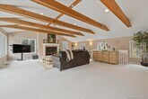 Call for Availability - Enjoy the feeling of being at a resort all year round. This wonderful contemporary home is designed for an active family and entertainment of guests on a grand scale. The house and grounds are beautifully designed and lovingly maintained. The floor plan features a gourmet kitchen, comfortable dining and living rooms plus a large family room with exposed beamed cathedral ceiling. This home is light and bright with large windows and walls of French doors. Situated on over an acre of rolling grass lawns surrounding a beautiful heated, gunite swimming pool with raised spa, all remotely controlled. A grand wood terrace, kitchenette area with gas grill and ample room for lounge chairs and tables. MLS# 24141418