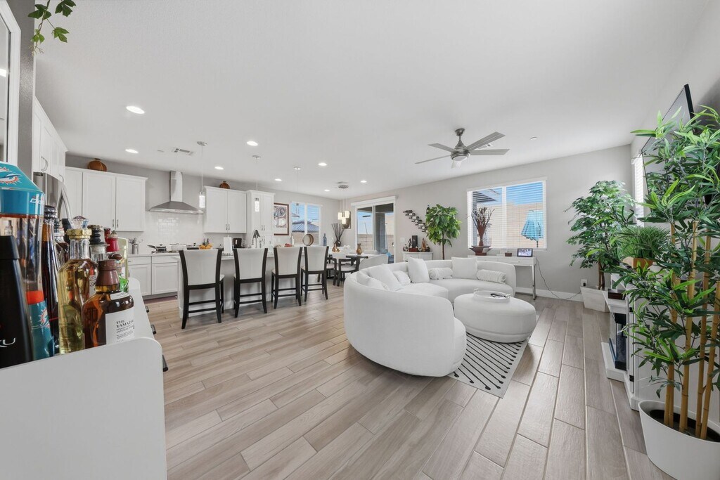 Experience refined living in this beautifully upgraded, model-like two-story home located in the highly sought-after Cadence community. Designed with style and sophistication, this 3-bedroom, 2.5-bath residence offers a seamless blend of modern elegance and everyday comfort. The stunning kitchen is a true centerpiece, featuring bright white shaker cabinetry, quartz countertops, stainless steel appliances, custom pendant lighting, and expanded cabinetry for additional storage. The open-concept layout flows effortlessly into the main living space, creating an inviting atmosphere ideal for both entertaining and relaxing. Upstairs, enjoy a versatile loft—perfect for a media lounge or home office—alongside well-appointed bedrooms and a spacious primary retreat. Premium upgrades include Smart Home technology, tankless water heater, ceiling fans throughout, window coverings, and a finished 2-car garage with epoxy flooring, Wi-Fi-enabled opener, and EV prewire. Step outside to a private, low-maintenance backyard complete with a paver patio, gazebo, and storage sheds—perfect for enjoying outdoor living year-round. Residents of Cadence enjoy access to an unparalleled lifestyle with expansive parks, scenic trails, resort-style pools, pickleball courts, fitness areas, and more. Discover luxury, convenience, and community all in one exceptional home.