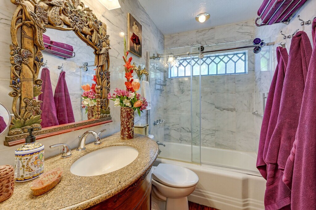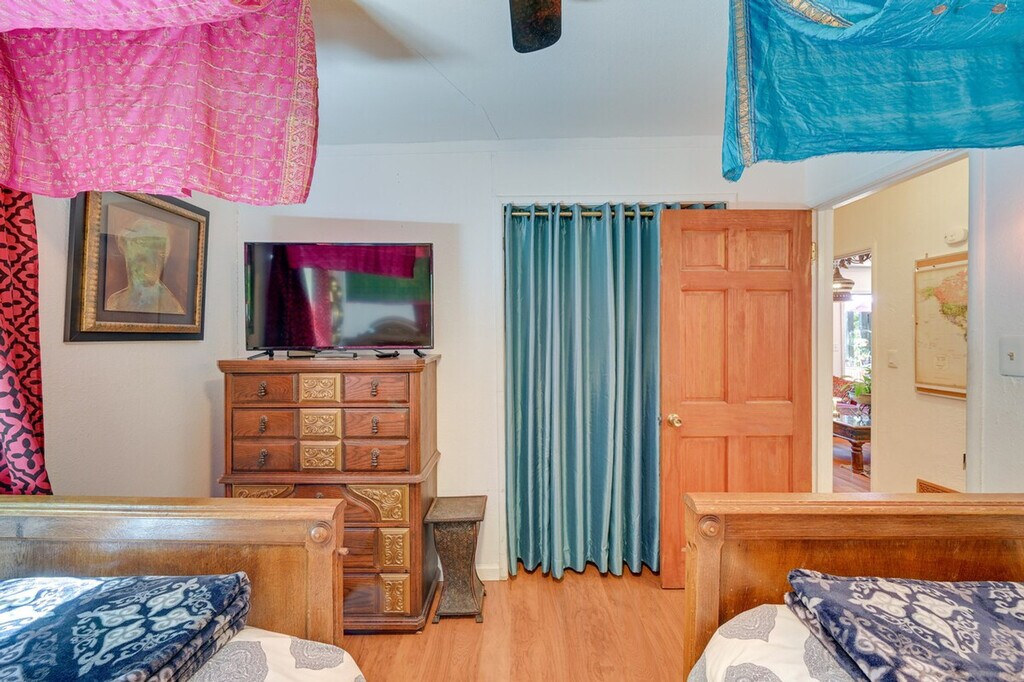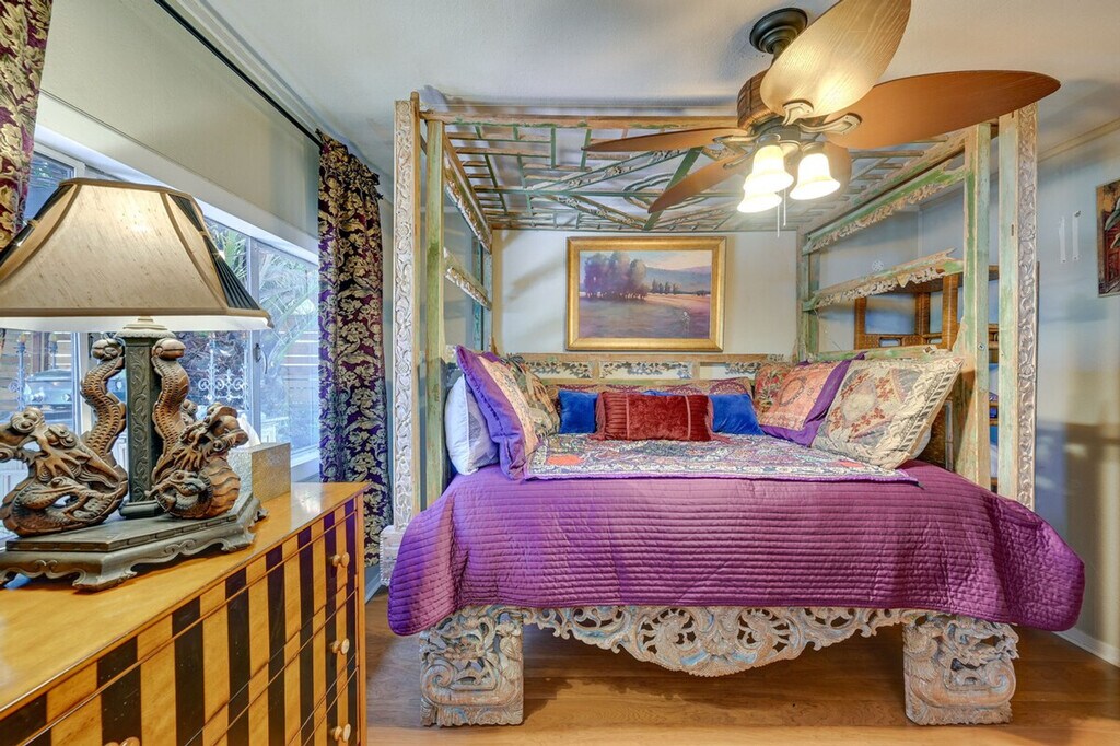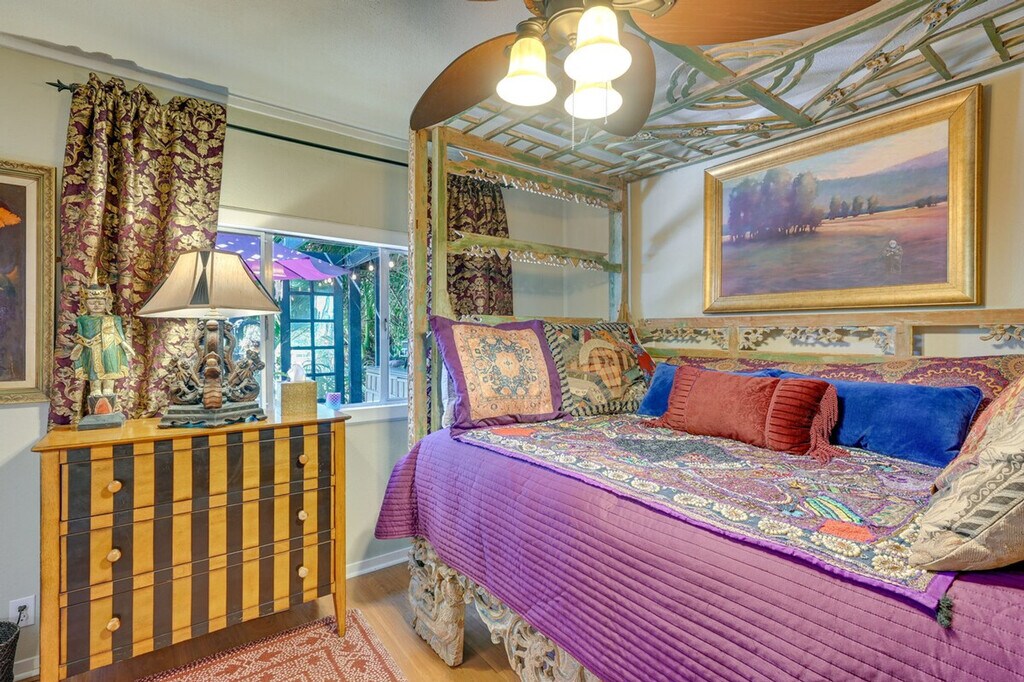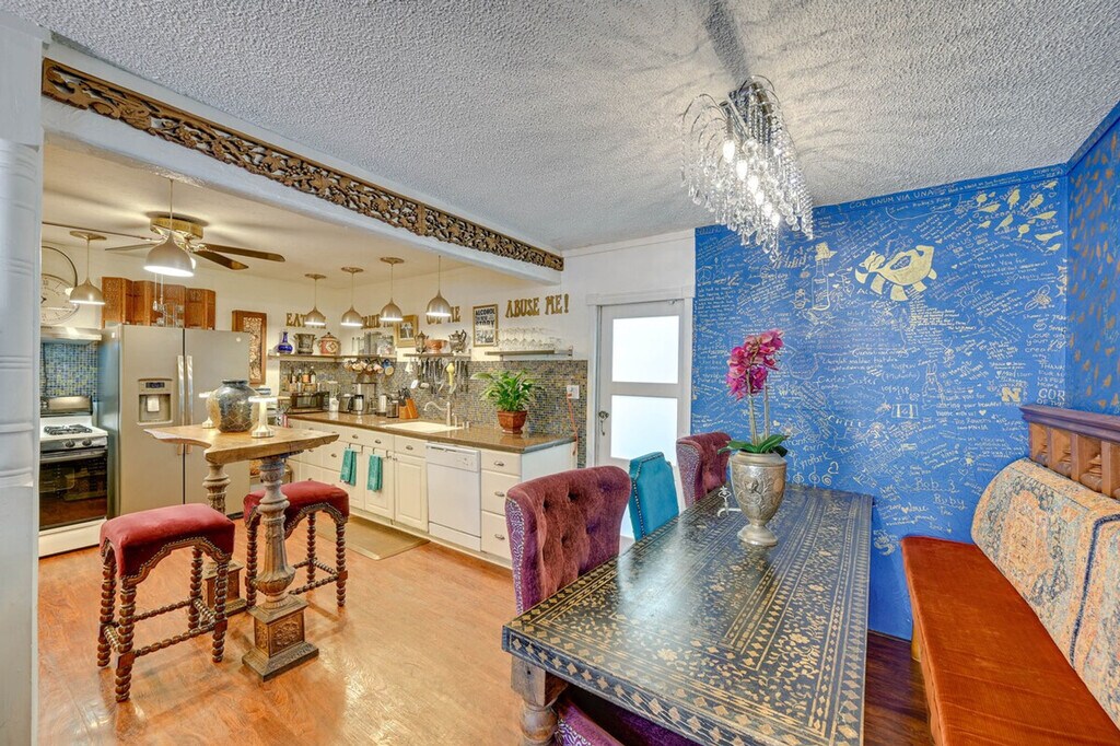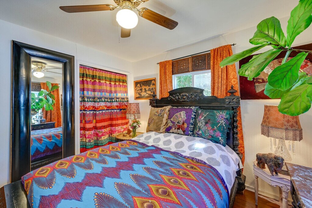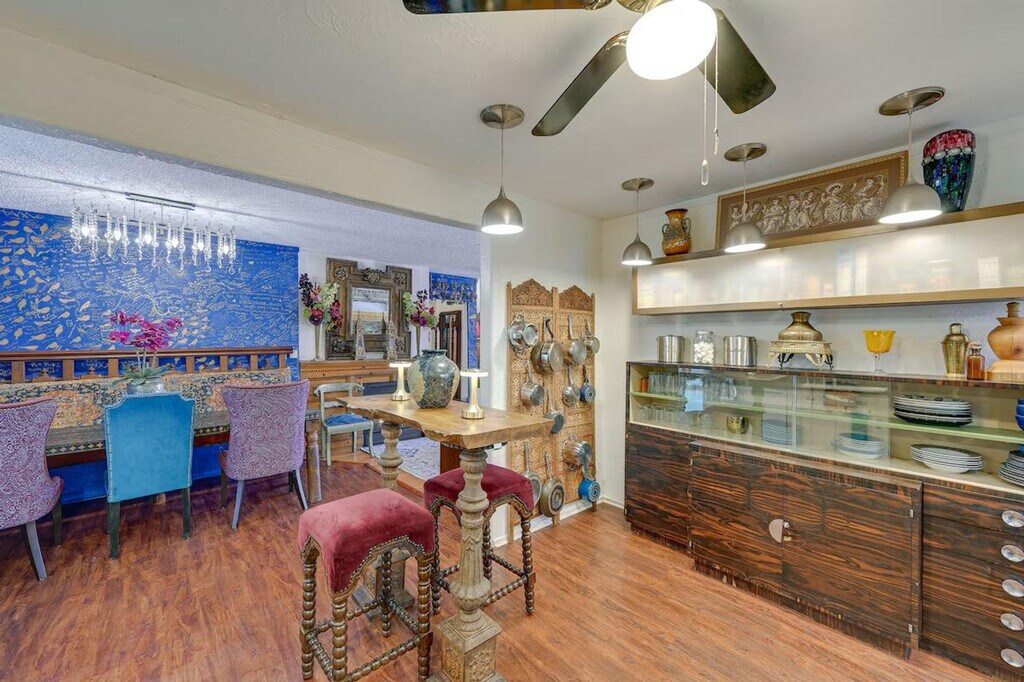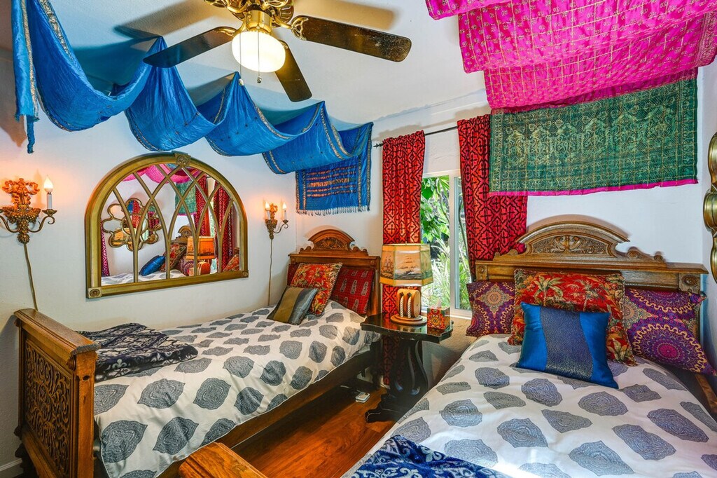 Your California dream awaits at this eclectic and colorful 3-bedroom, 1-bath house. This home boasts unique Eastern-inspired furnishings and lavish outdoor entertainment space, complete with a pergola and firepit. Additionally, you'll have easy access to the BART system, allowing San Francisco and Berkeley's endless attractions to be right at your fingertips. If you choose to stay in, dine al fresco amidst gorgeous succulent foliage and take in the mountain air from the backyard. Experience California in a vacation rental that's not so run-of-the-mill at this colorful and ornately decorated villa, which creates the perfect ambiance for entertaining friends and family. The outdoor living space includes a front patio with patio furniture and an outdoor dining area. Inside, enjoy 2 cable TVs, a DVD player, a gas fireplace, and a dining table. The well-equipped kitchen features a breakfast bar, electric kettle, French press coffee makers, coffee grinder, toaster, toaster oven, spices, dishware, flatware, and a stove/oven. Pet friendly with a $50 fee for one pet. Parking is available in the driveway for 2 vehicles. This property offers easy access to the BART system, making San Francisco and Berkeley's endless attractions easily accessible. Enjoy the convenience of exploring nearby destinations while having a peaceful retreat to return to. The property requires 2 steps for access. Smoking is not allowed. No events, parties, or large gatherings are permitted. The homeowner lives on-site in a separate unit and may be present during your stay. Cats are on the property but do not enter the rental unit. [SI]