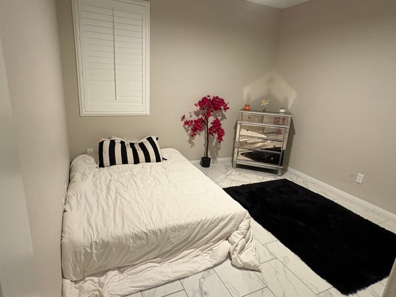 Property Id: 2446213 Downstairs private room with private bathroom. Marble floors in both the room and bathroom, marble granite countertops, ceiling fan with white wooden shutters. The room is approximately 644 ft.². ?